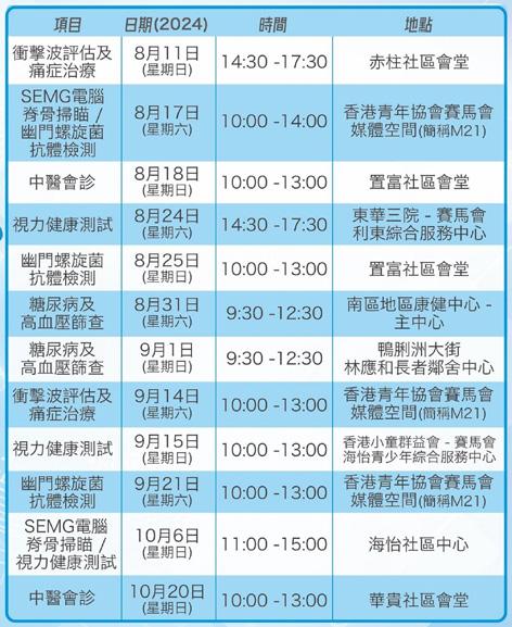 今年活動包括20場免費健康檢查,包括提供SEMG電 腦脊骨檢測、衝擊波評估及痛症治療、幽門螺旋菌抗體檢 測、視力健康檢測、中醫會診、糖尿病及高血壓篩查等。 活動還設有季節性流感疫苗接種、專題醫療講座及工作坊、 「健康定向在南區」比賽等。活動地點遍及南區各處,務 求全面覆蓋整個南區,鼓勵南區居民 學習健康管理,提高健康意識。