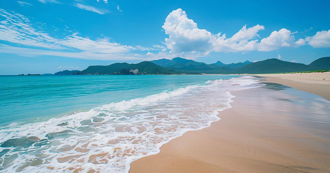 驕陽似火,也不能阻止我和我朋友去海邊玩耍的熱情。一下 車,眺望遠處湛藍的海洋,大海一望無際,像在島上鑲嵌了一顆閃 耀的藍寶石,海的周圍彷若鍍上了一圈細碎的鑽石銀邊。