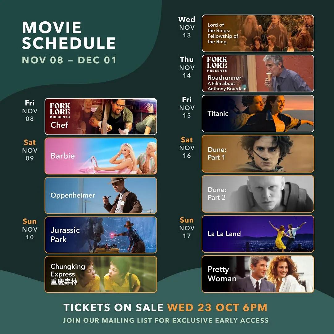 The Grounds 以不同主題輪流放映多部人氣和經典電影,包括近 年獲獎無數的《奧本海默》、《沙丘瀚戰》、《Barbie芭比》,到經 典作品《侏羅紀公園》、《魔戒三部曲》、《星球大戰》,甚至是港 產片「神作」《重慶森林》、《功夫》、《食神》等,總有一套適合你。