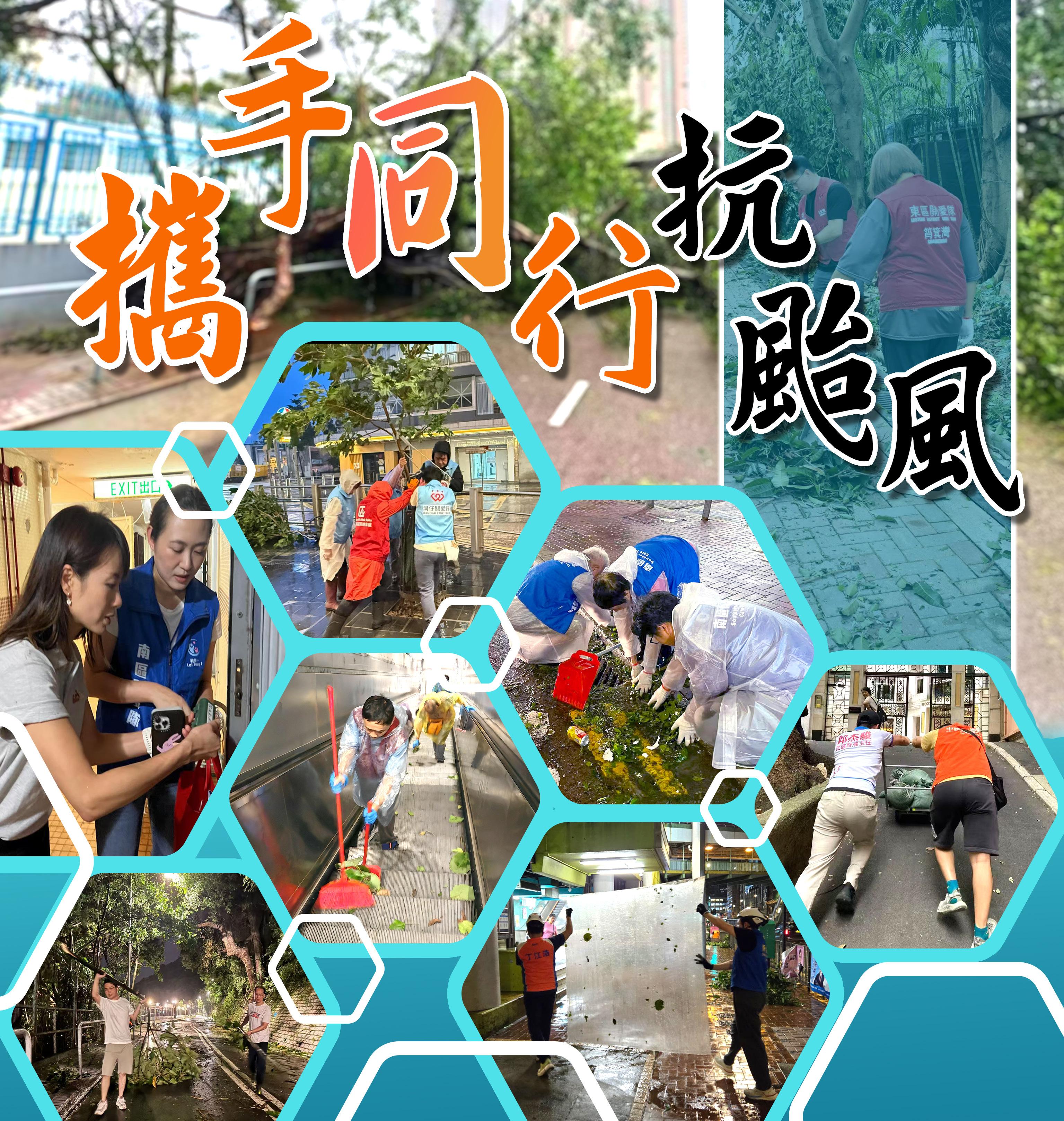 東區部分區議員赴歌連臣角道寮屋區, 協助行動不便的街坊轉移至銅鑼灣臨時庇 護中心。天后關愛隊重點巡查水浸黑點, 清理勵德邨水渠垃圾,確保排水暢通,派 發防風海報,備妥應急物資。南區關愛隊 與區議員特別關注獨居長者和雙老家庭的