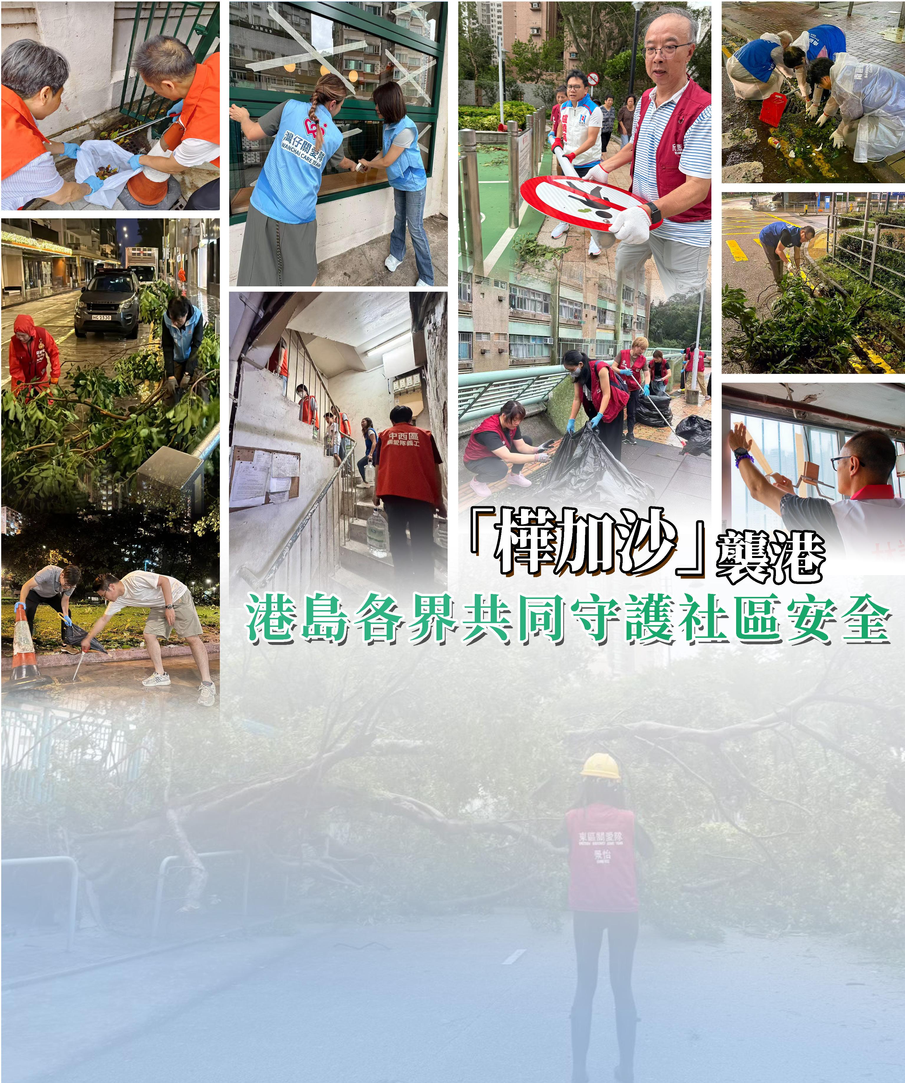 超強颱風 「樺加沙」來襲,天文台掛起「十號風球」並維持超10小時,為本港有記錄以來第二長。港島各界 全面啟動防風應急機制,區議員、關愛隊員和義工們全身心投入防風準備工作,從疏散弱勢居民、排查安全隱患, 到加固社區設施、發布颱風資訊,再到颱風過後全力應對風災恢復工作,共同守護社區安全。