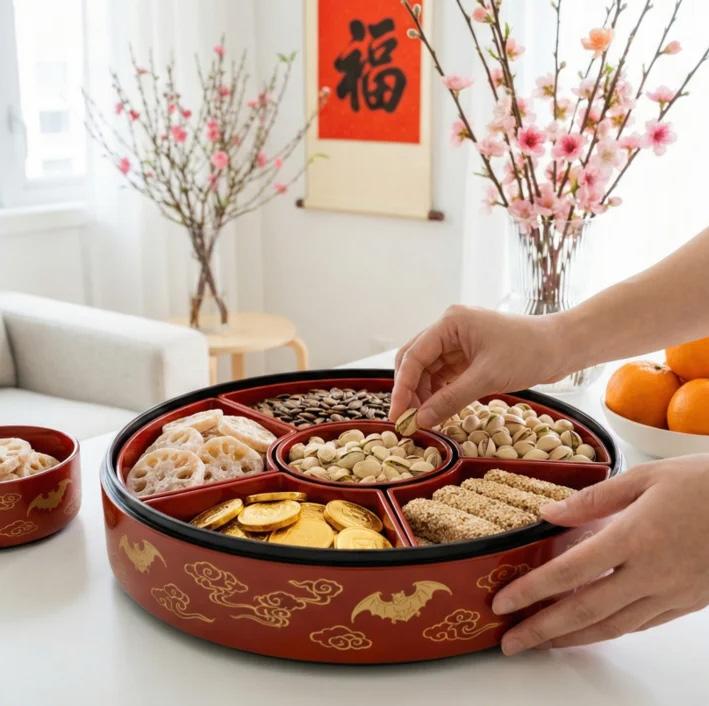 除夕當天,家庭會更換春聯與揮春,在門戶張貼「大 吉大利」「迎春接福」等吉祥紅聯,門神畫像則用於辟邪 護宅,張貼時需端正整齊,勿歪斜以維持吉祥氣場。同時, 傳統家庭會準備圓形或多格「全盒」款待拜年親友,寓意 十全十美、團團圓圓。盒內備有糖蓮子(年生貴子)、糖 冬瓜(好頭好尾)、糖蓮藕(佳偶天成)等八款甜食,搭 配瓜子、笑口棗、油角等炸物,象徵家肥屋潤、生活甜蜜。