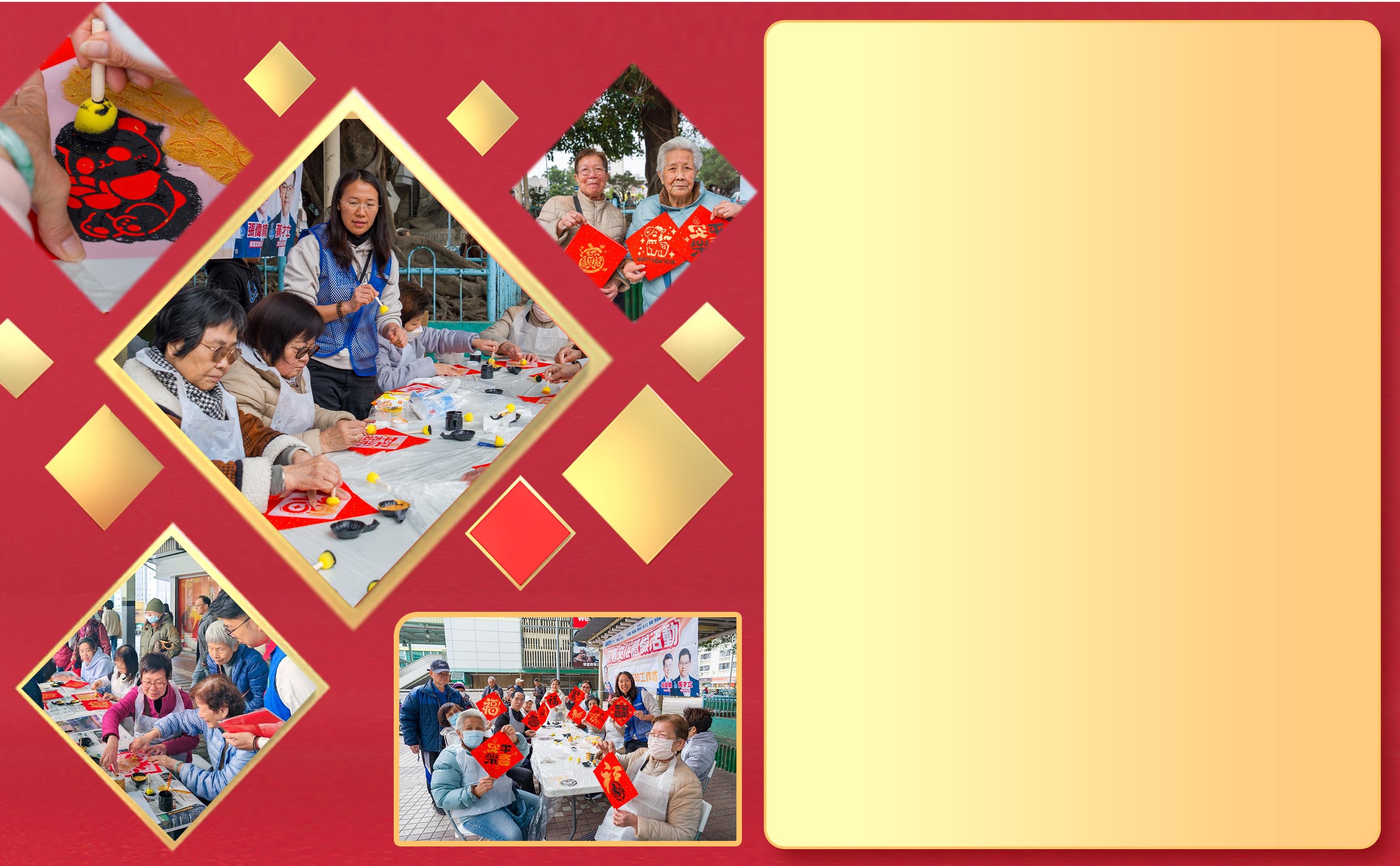 除了正宗手寫書法外,參加者還即席發 揮創意,畫上不同圖案裝飾,設計出獨一無二 的揮春。參加者都很高興可以學習正宗毛筆書 法,又可以將精美的揮春帶回家中,與家人一 起共賀新歲。
