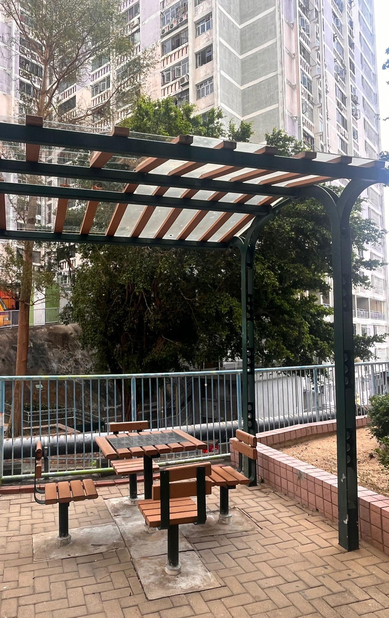 去年夏季的強烈颱風給本港帶來連番破壞,位於華 泰樓旁的這個涼亭亦未能倖免。當時狂風肆虐,導致涼 亭部分瓦頂不敵強風脫落,散落一地,現場須暫時圍封。 該涼亭地處屋邨要道旁,且毗鄰小童群益會,平日無論 是接送子女上落課的家長,或是晨運後小憩的長者,均 習慣在此歇腳。亭頂損毀後,失去遮蔭之處,炎炎夏日 之下,居民只能匆匆路過,無法停留,頗感不便。