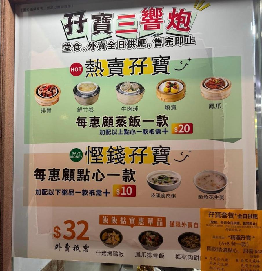 據「優點點心專門店」海報顯示,該店有提供多款優 惠套餐,包括點心加粥的「慳錢孖寶」、蒸飯加點心的「熱 賣孖寶」、燉湯加蒸飯或點心的「健康孖寶」等。其中又 以只需$42便可享用兩款點心的「孖寶套餐」最為吸引人, 選擇包括香煎蘿蔔糕、安蝦鹹水角、爽滑牛肉腸、名醬蒸 鳳爪等粵式經典點心,大有昔時茶樓「一盅兩件」之貌。