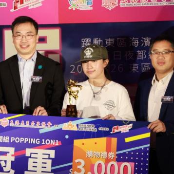 活動吸引超過百位青年舞者報名參賽,比賽期間,選手們以精湛技巧與獨特編排 贏得全場喝彩,氣氛熱鬧非凡。歷經數小時激烈角逐,最終由青年參賽者「付子恩」 和「Jaylee」分別勇奪Hip Hop 1 on 1及Popping 1 on 1的項目冠軍。傍晚舉行的頒獎 禮更將氣氛推至高峰,為社區注入青春正能量,展現東區文化多元魅力。