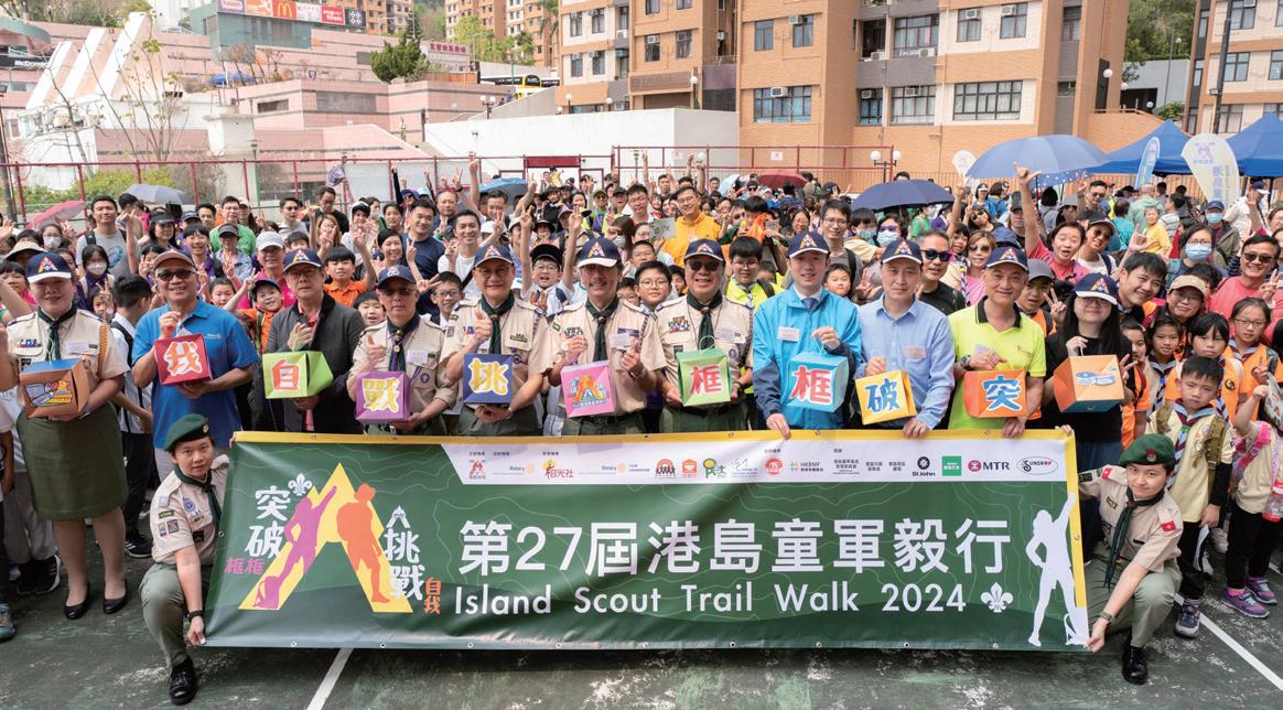 今年再次以虛擬跑及實體賽「雙賽 制」的形式進行,讓各童軍成員能靈活參 與。「第27屆港島童軍毅行實體賽」已 於2024年3月17日在風和日麗的天氣下 順利舉行,當天除設有50公里(大浪灣 至山頂)以及25公里(布力徑至山頂) 長途比賽組別外;同時亦設6公里(置富 至山頂)及3.5公里(環繞山頂盧吉道及 夏力道)非比賽組別,以供不同年齡的人 士同行,享受郊遊的樂趣。大會更為非比 賽組參加者準備了小冊子,讓小朋友了解 不留痕及地球部落挑戰等知識。今年繼續 設有區際邀請賽及制服團隊邀請賽。本屆 的比賽組別及非比賽組別總參加人數約 1200人。大會還邀請了其他外界機構參 與,包括「共創明『Teen』計劃」、香 港中華基督教青年會柴灣會所、香港移植 運動協會及育智中心等。