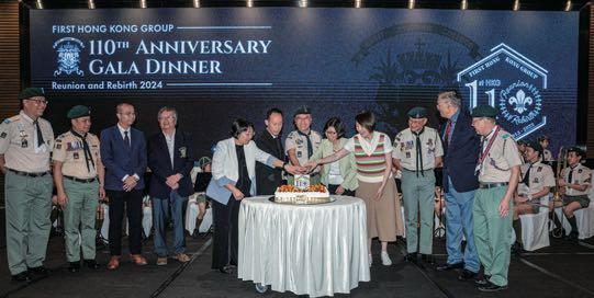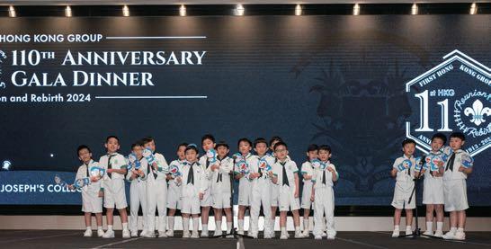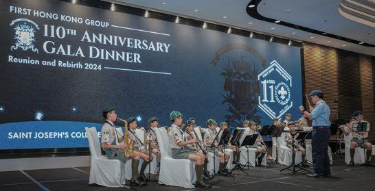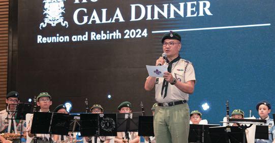 隨後,精彩的小童軍和幼童軍的歌舞表演,以及管 樂隊演奏多首耳熟能詳的樂曲更大獲好評,把晚宴的氣 氛推至最高峰。而整個晚宴的過程亦透過網上平台作互 動廣播,世界各地的第1旅成員都能於線上參與,貫切 Reunion的主題。地域總監楊國光博士亦是坐上賓客,在 恭賀港島第1旅到達了110周年這一非凡里程碑的同時, 亦提到在過去一個多世紀以來,旅團一直幫助年輕人學習