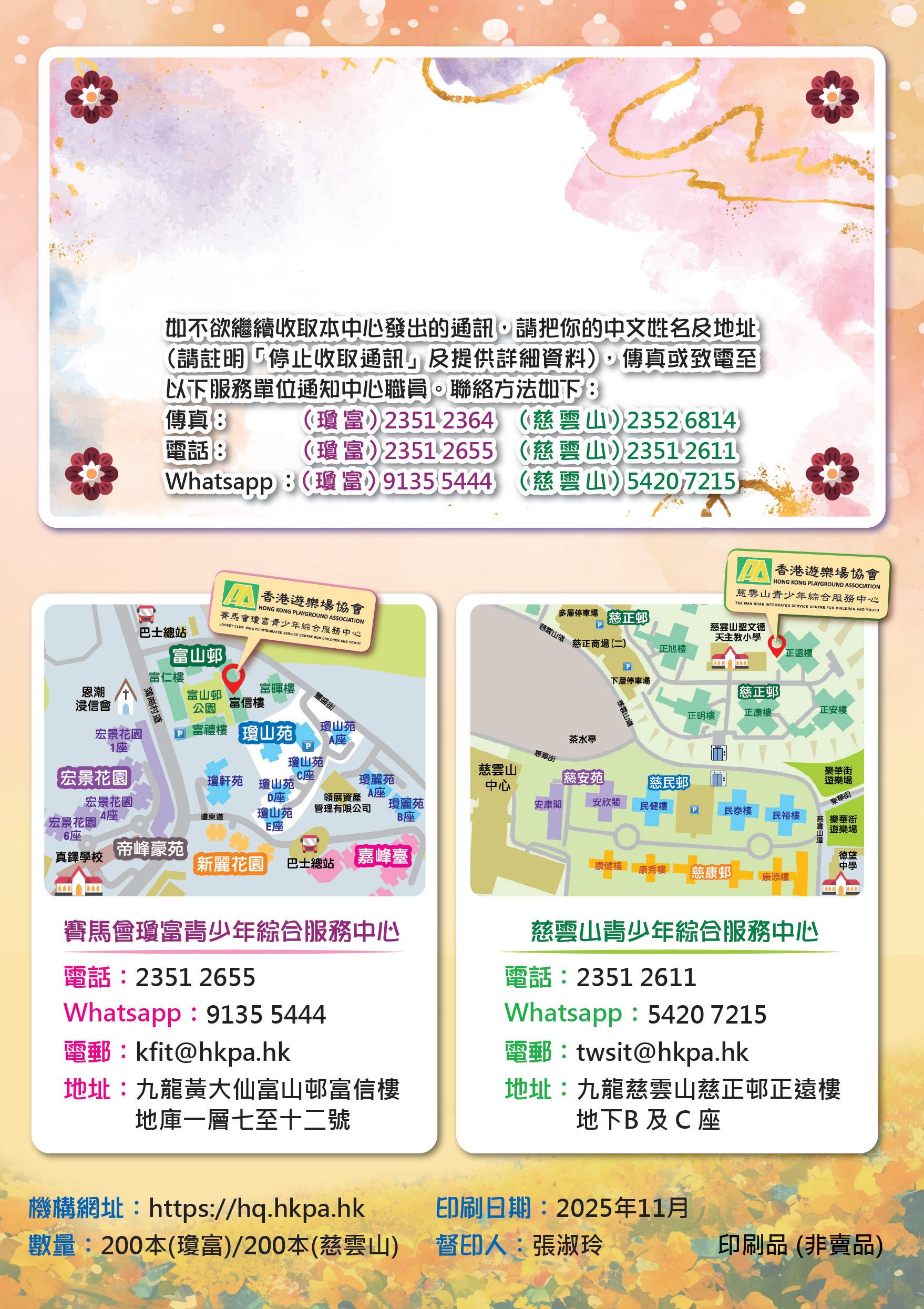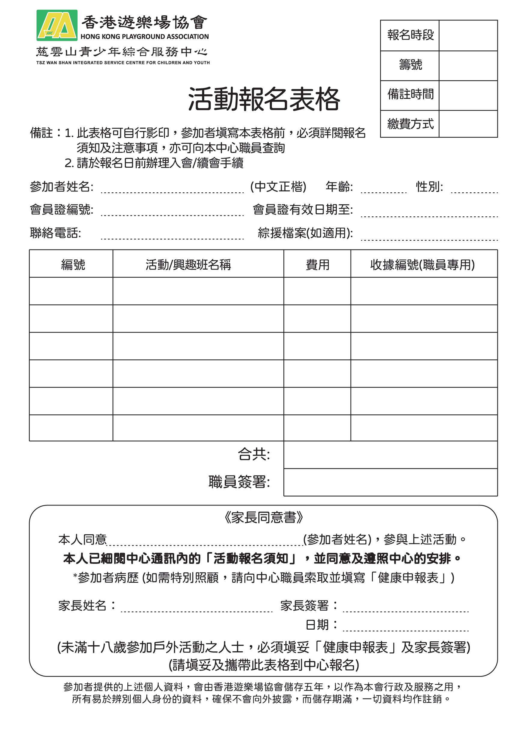 備註:新生請到臨慈雲山青少年綜合 服 費用:$100 (會員每季) 務中心向櫃枱職員留名登記輪候 負責職員:Crystal Miss (註冊社工)