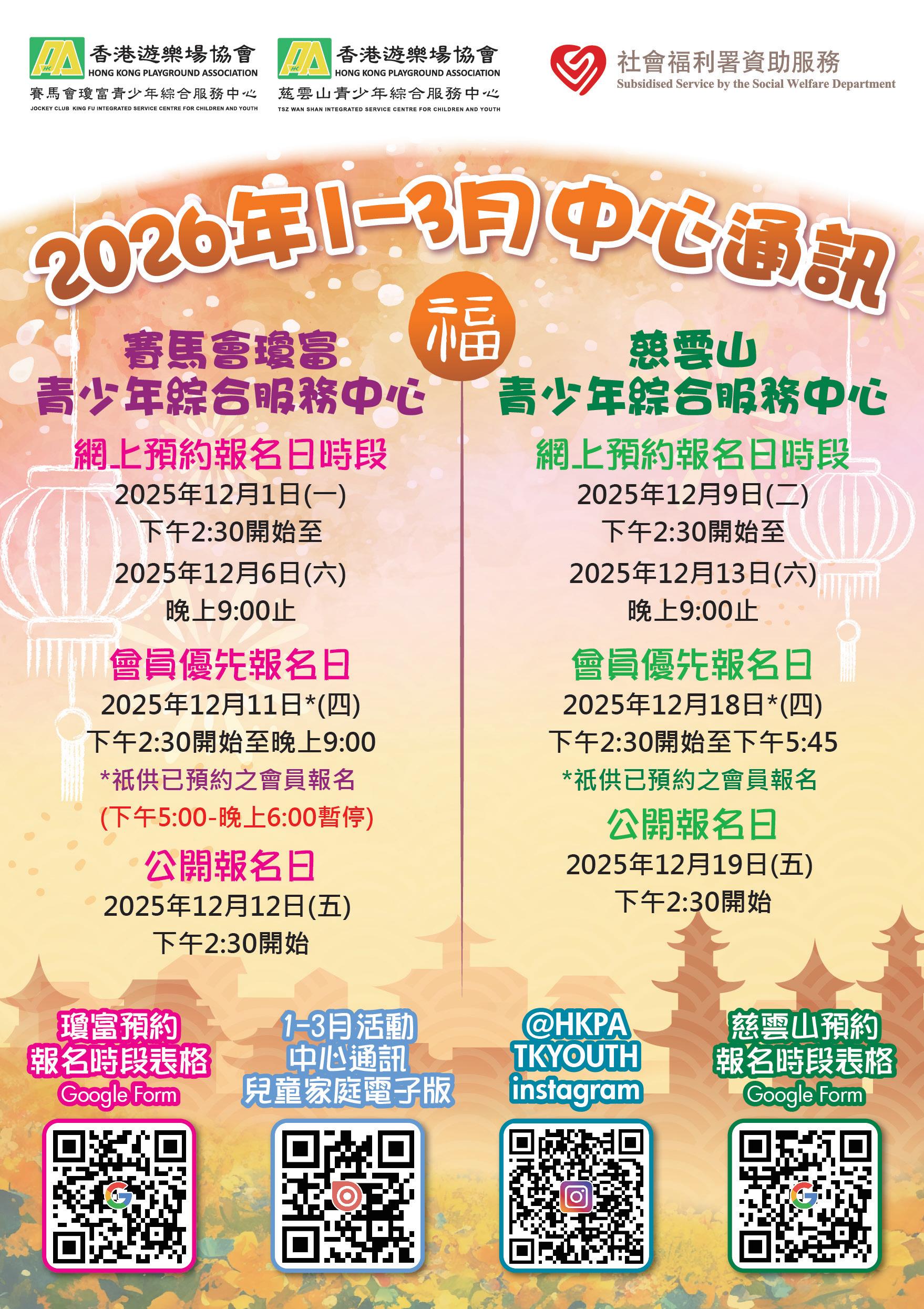 如預約登記時間已滿額,請於公開報名日 2025年12月19日(五)下午2:30到中心報名