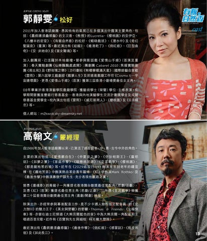 加入劇團前,已活躍 於本地劇壇。曾參與影話戲《愛情山手線》 (首演及重 演);春天實驗劇團《仙樂飄飄處處聞》;團劇團 Cabaret 2010;焦媛實驗劇 團《南北和》及《野玫瑰之戀》;力行劇社《有樣學樣滿天星》;國際綜藝合家歡 《雷雨》;第六屆華文戲劇節《戲夢人生》及前進進戲劇工作坊《Cosmo X —宇 宙連環圖》,更憑《愛情山手線》 (首演)獲第三屆香港小劇場獎最佳女主角。 08年畢業於香港演藝學院戲劇學院,獲藝術學士(榮譽)學位,主修表演。在 學期間曾獲滙豐銀行慈善基金—香港與內地演藝學生交流計劃獎學金及成龍 慈善基金獎學金。校內演出包括《雷雨》 、 《威尼斯商人》 、 《櫻桃園》及《日月精 忠》等。 個人網站:m2kwok.sky-dreamsky.net