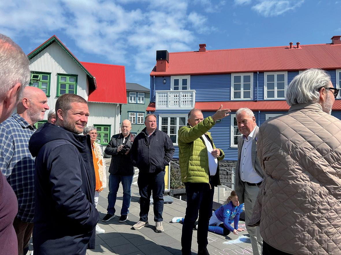 Yllä: Kuvassa Selfossin keskustan uusia taloja, mittavasta rakennusprojektista kertoo ryhmälle arkkitehti Jón Ólafur Ólafsson.