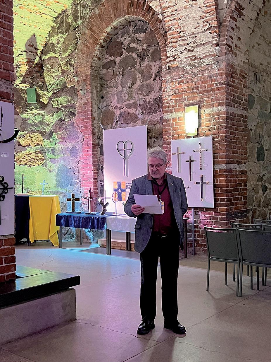 toivo ja luottamus tulevaisuuteen, ja yritetään saada alistumaan mielivallan alle. – Mutta jos me taipuisimme tämän alle, ja olisimme menettäneet uskomme ja toivomme tulevaisuuteen, olisimmeko me nyt täällä, herätti Jouko kuulijoille kysymyksen ja päätti puheensa kiitoksiin niille, jotka ovat osaltaan olleet näyttelyä mahdollistamassa, pystyttämässä ja tukemassa. Avajaisissa näimme myös tallenteelta seppä Serhii Polubotkon terveiset näyttelyn järjestäjille ja katsojille.