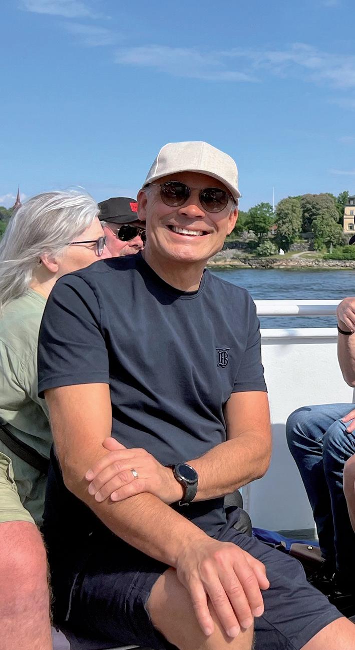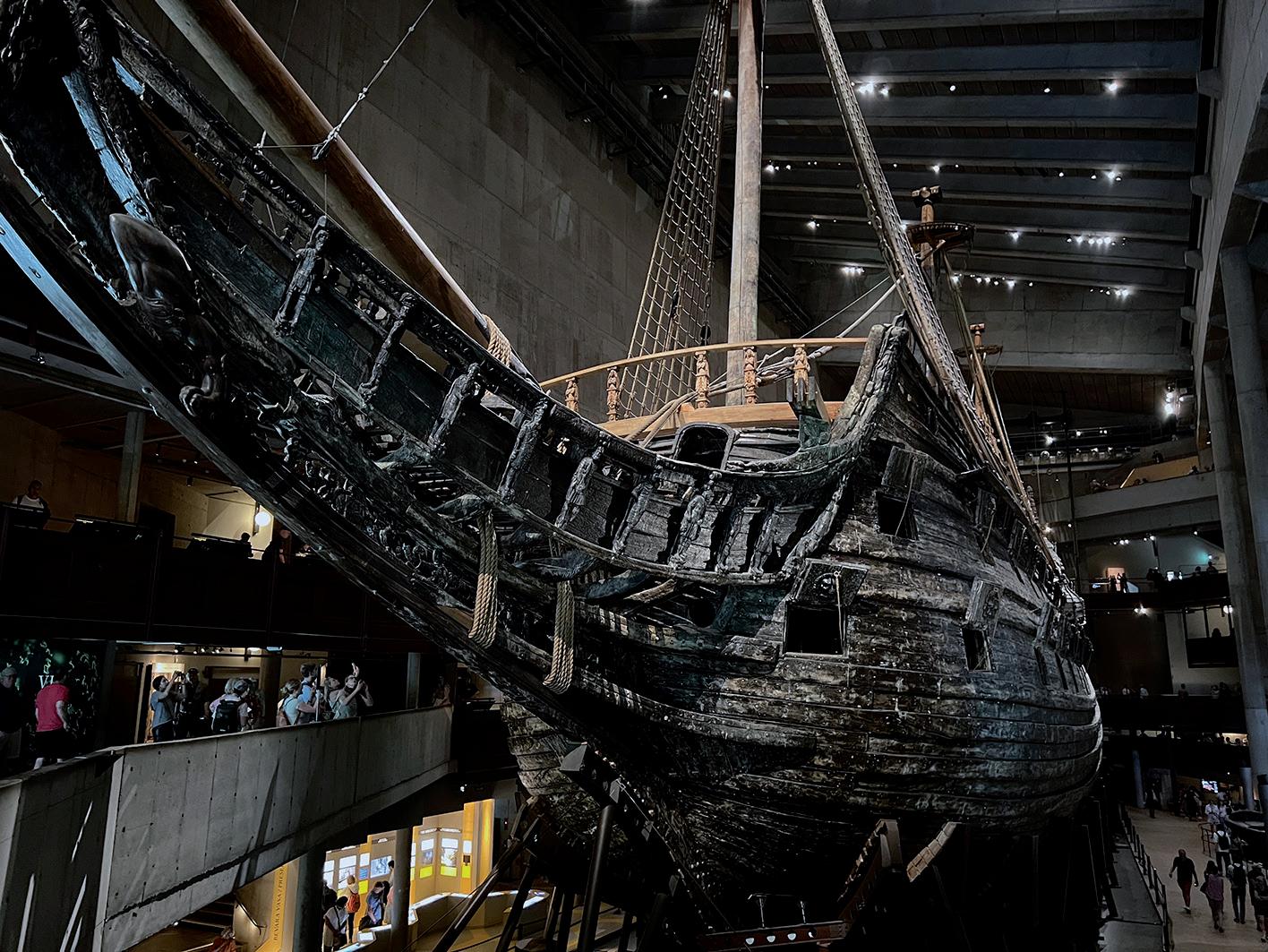 Viereinen sivu ja yläkuvat: Retkipäivänä näimme Kuninkaanlinnan ja hienoja saaristomaisemia veneestä käsin, huomaa kalliojyrkänteen rantasauna. Yläkuvassa kultaajamestari Harri Virtanen. Vasemmalla: Vasa museo hylkyineen oli ainutlaatuinen vierailukohde. Vasa-laiva upposi vuonna 1628 ensimmäisellä matkallaan Tukholmassa purjehdittuaan vain 1200 m ja nostettiin vuonna 1961. Loistava oppaamme Stefan johdatti ryhmää museossa.