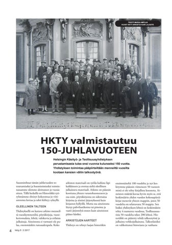 HKTY valmistautuu 150-JUHLAVUOTEEN Helsingin Käsityö- ja Teollisuusyhdistyksen perustamisesta tulee ensi vuonna kuluneeksi 150 vuotta. Yhdistyksen toimintaa pääpiirteiltään menneiltä vuosilta kootaan kansien väliin talkootyönä. Suunnitelmat tämän juhlavuoden toteuttamiseksi ja huomioimiseksi toiminnassamme olemme aloittaneet jo vuosia sitten. Tällä hetkellä on Historiikki-työryhmämme ehtinyt kokoontua jo viitisentoista kertaa ja tahti kiihtyy syksyllä. OLEELLINEN TALTEEN