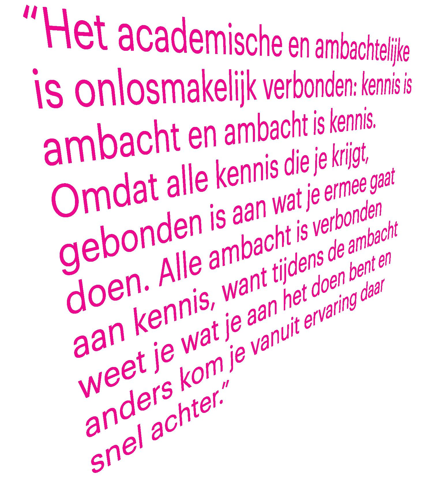 fashion en andere kunstvormen. Zij reflecteren op kunst door hun kennis van de cultuurhistorische context. In de Meerjarenstrategie 2030 benoemen we nadrukkelijk deze wezenlijke interactie tussen ambachtelijk én academisch en de balans daartussen.