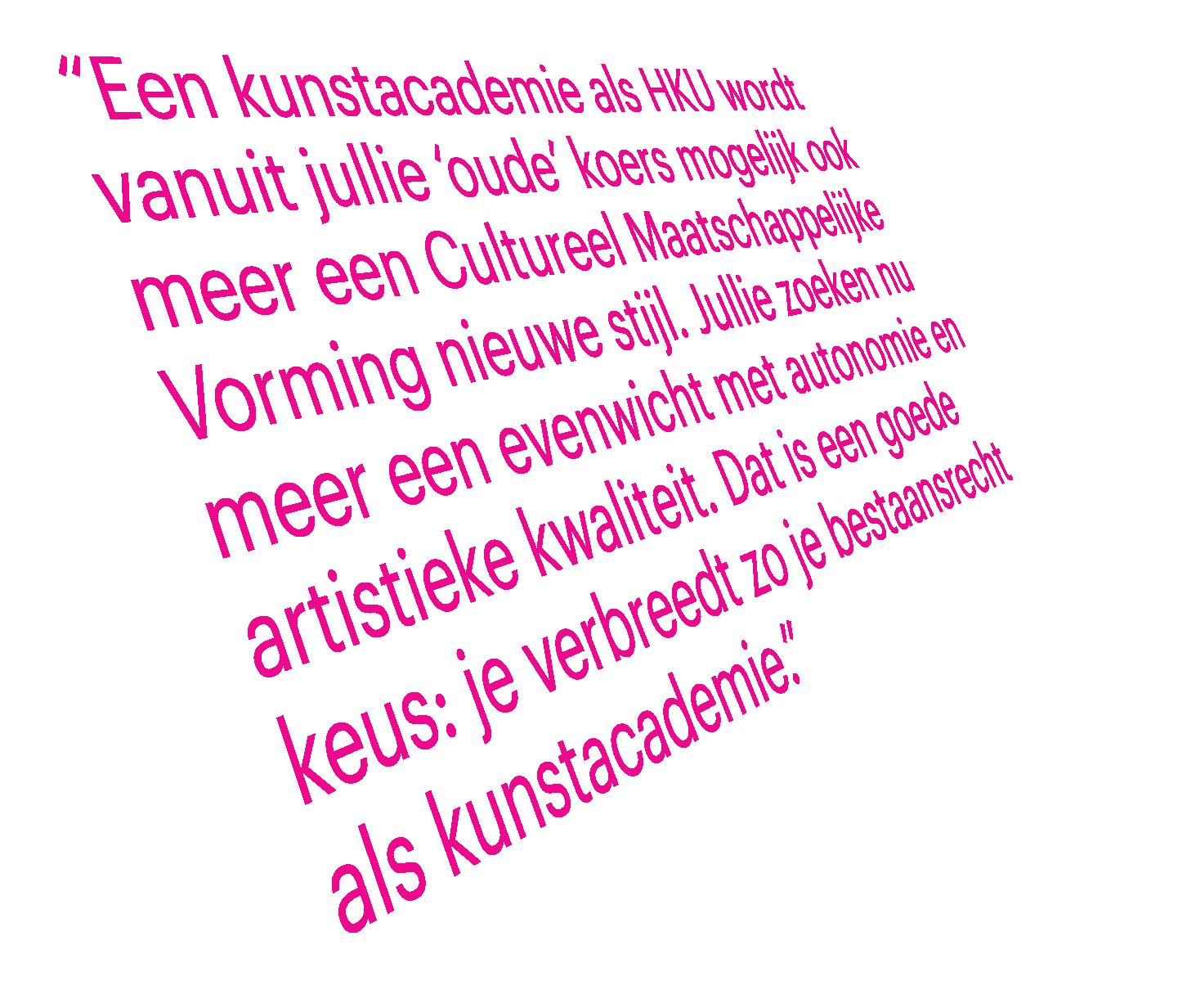 En dit is nog maar een greep van de elementen uit het onderzoek en het onderwijs van HKU. Onderwerpen waar studenten, kennis- en werkveldpartners en medewerkers met elkaar over uitwisselen, leren, studeren en altijd ook maken. Ook in de vele verbindende en soms intense dialoogsessies en interviews met studenten, docenten, medewerkers, beleidsmakers, kunstenaars, kunstkenners en wetenschappers kwamen deze elementen terug.