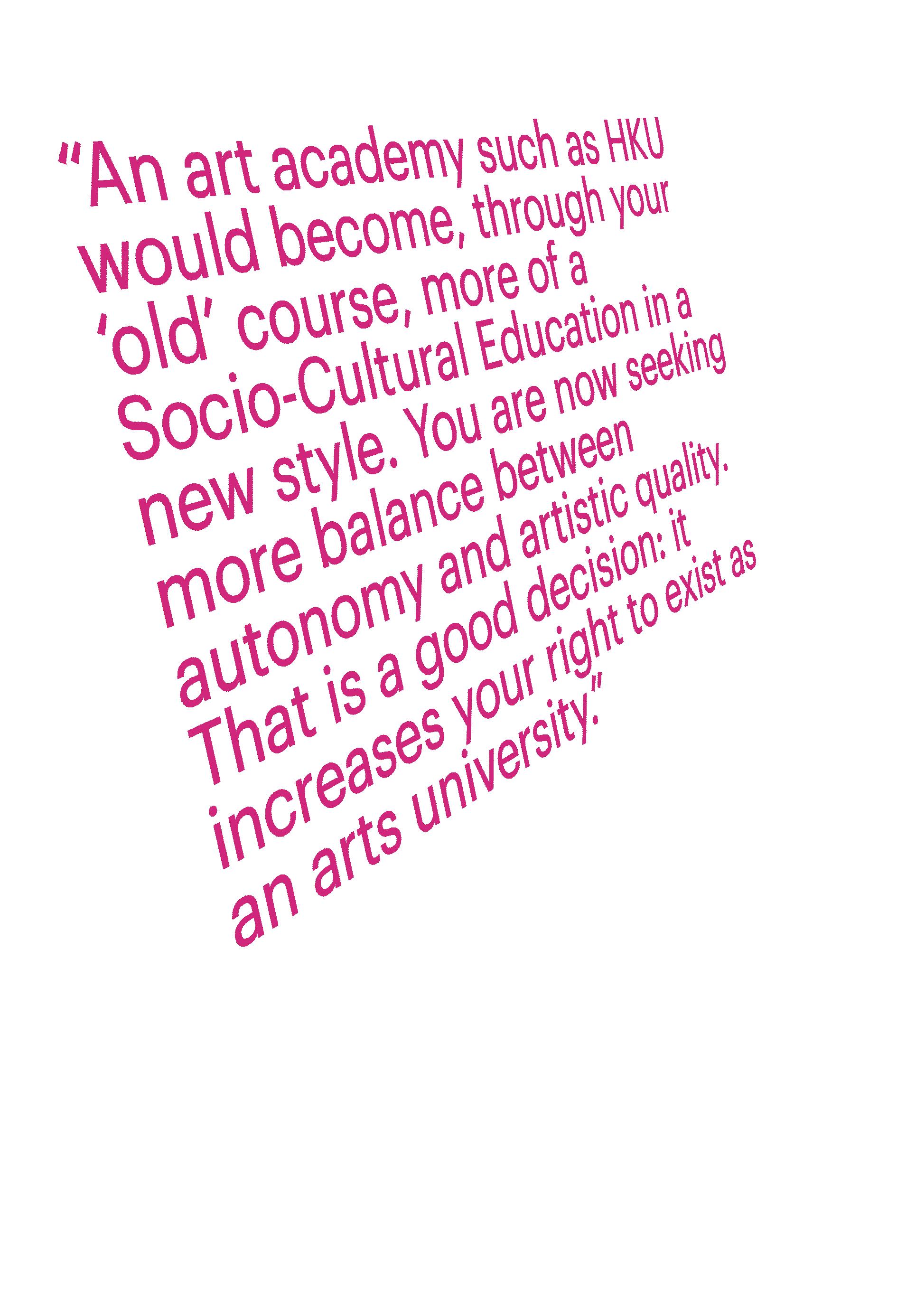 HKU wants more attention for the balance between shape and substance. As simple as this may sound, it is anything but. It invites to create a culture within HKU where there is room for discussion and a permanent contemplation on the best form of arts education in the arts. This is exactly how new expressions within the arts about our current times can gain attention. In this room, questions can rise about the role of fully autonomous expression as creator. What is the meaning of art in its diverse contexts? And what does rewriting the Western modernist canon in our society mean exactly?