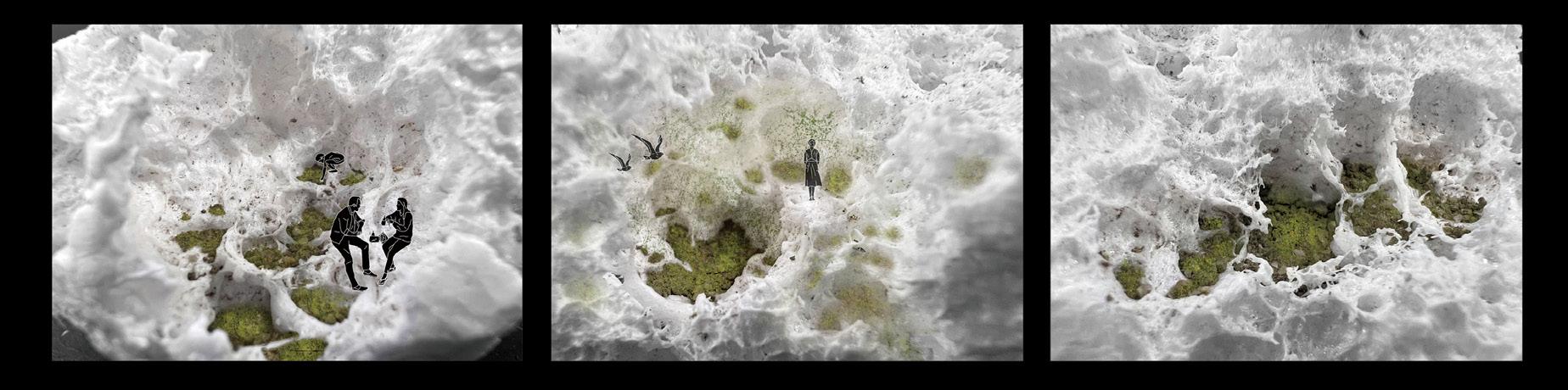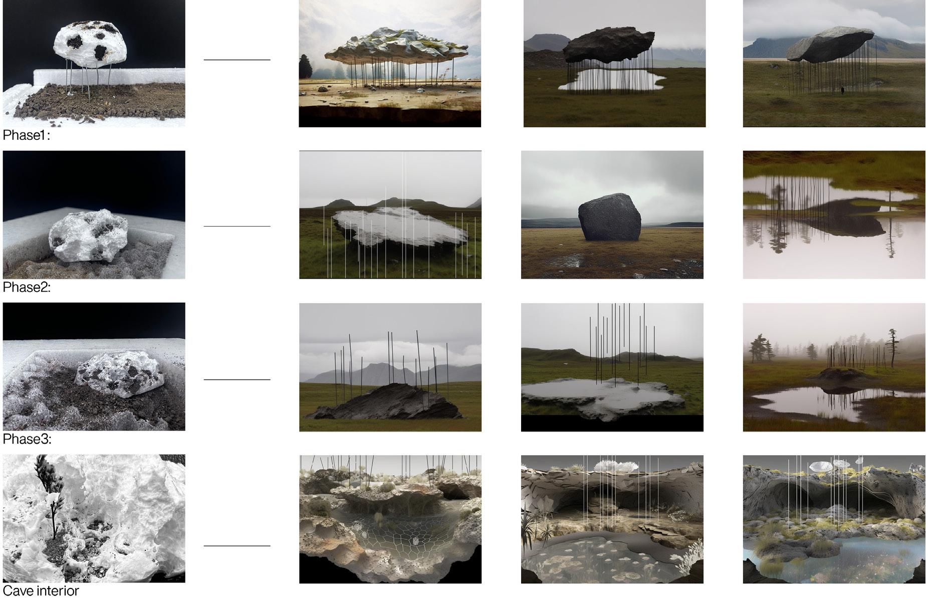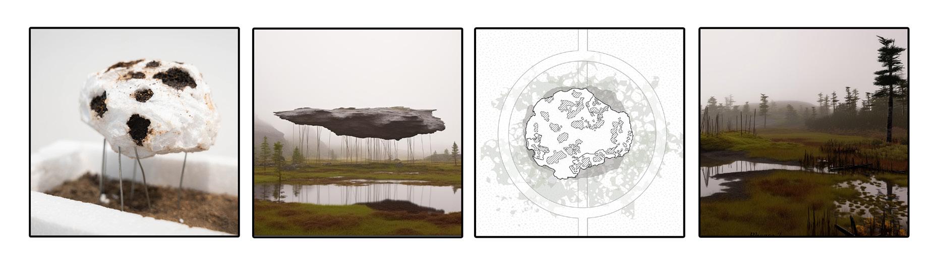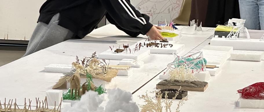 The exercise relies on the physical model to develop the proposal from concept to scheme. Interventions should not encompass the entire 1-hectare area; instead, the intervention will be limited to 15%-50% of the total footprint. Models will be fed to Mid Journey and driven by prompts derived from key research terms. The final step is to translate and ground these speculations into plan and section. This spread comprises the 25 physical models and their corresponding pages within this document.