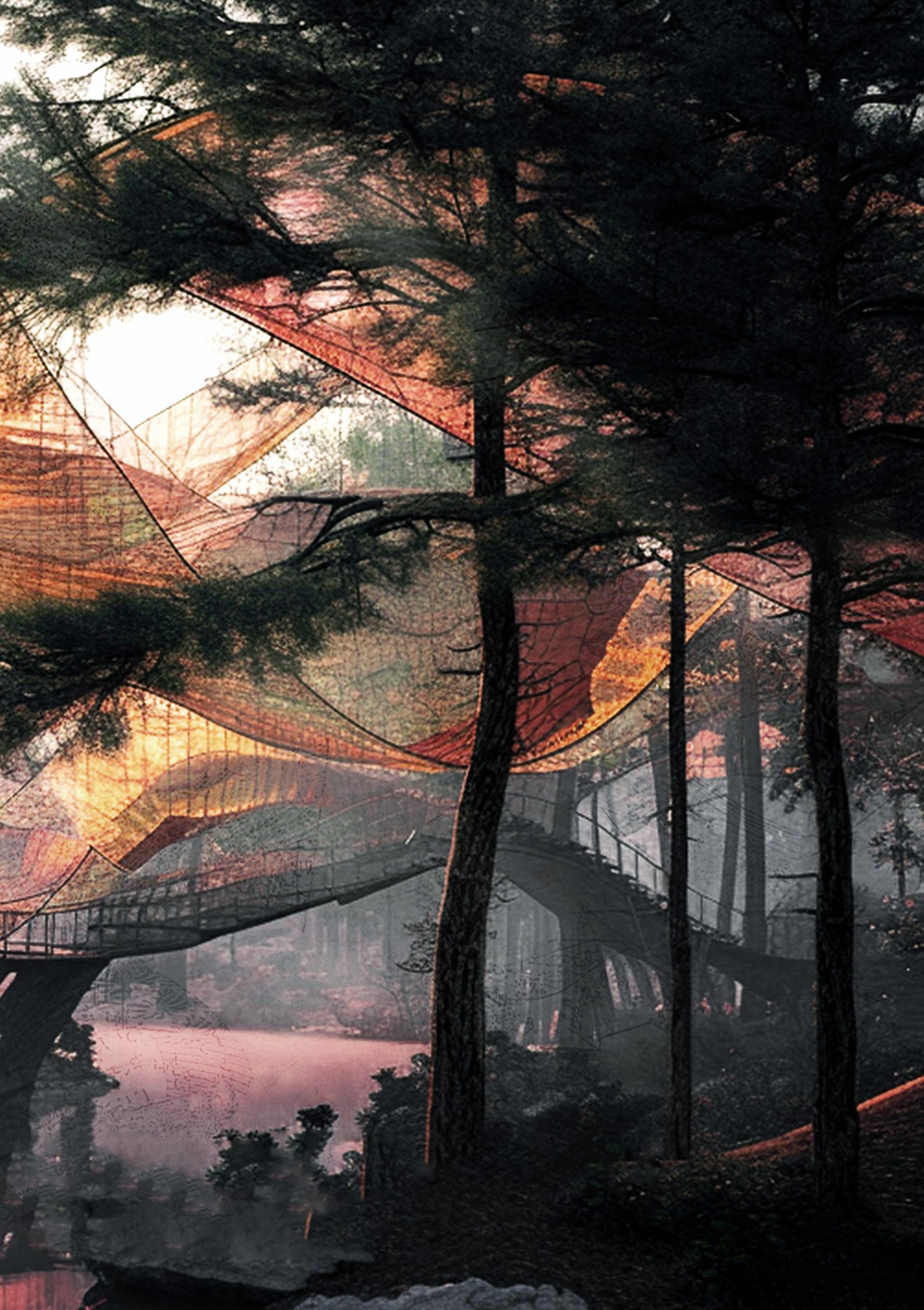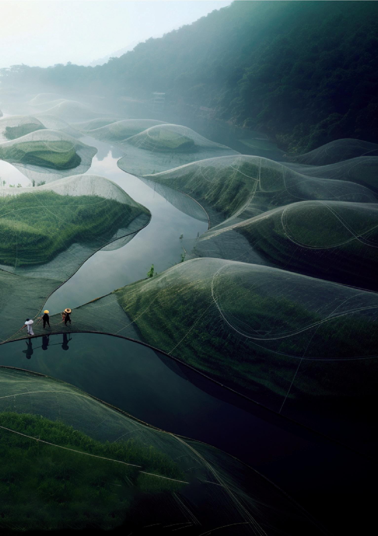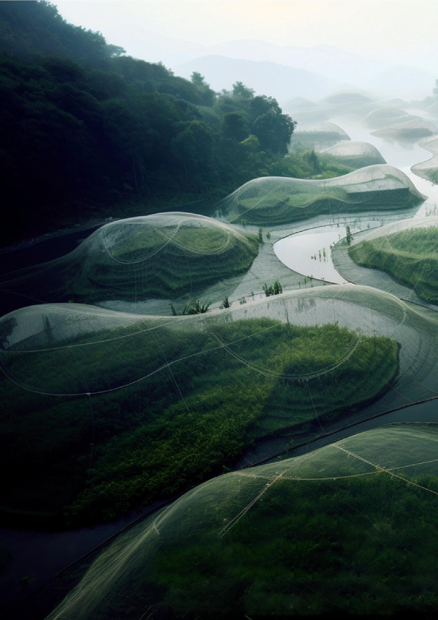 Aerial view, a huge net floating, fly net on the river, floating natural device, nature-inspired imagery, bamboo floating road behind the net, translucent net across the water, in the style of a futuristic architecture, shilin huan, andreas levers, traditional landscapes shibori, mountainous vistas, eco-kinetic --ar 128:85