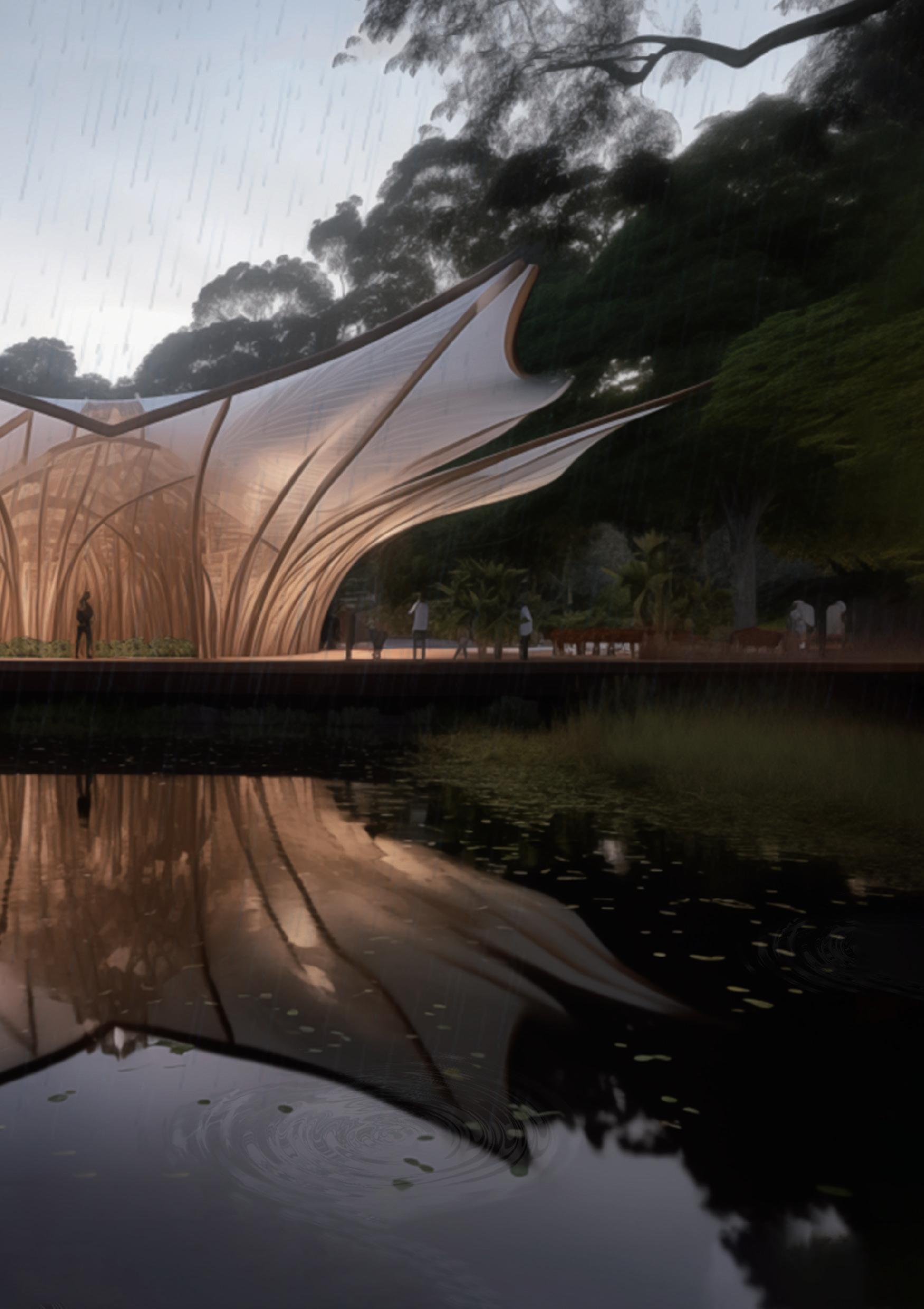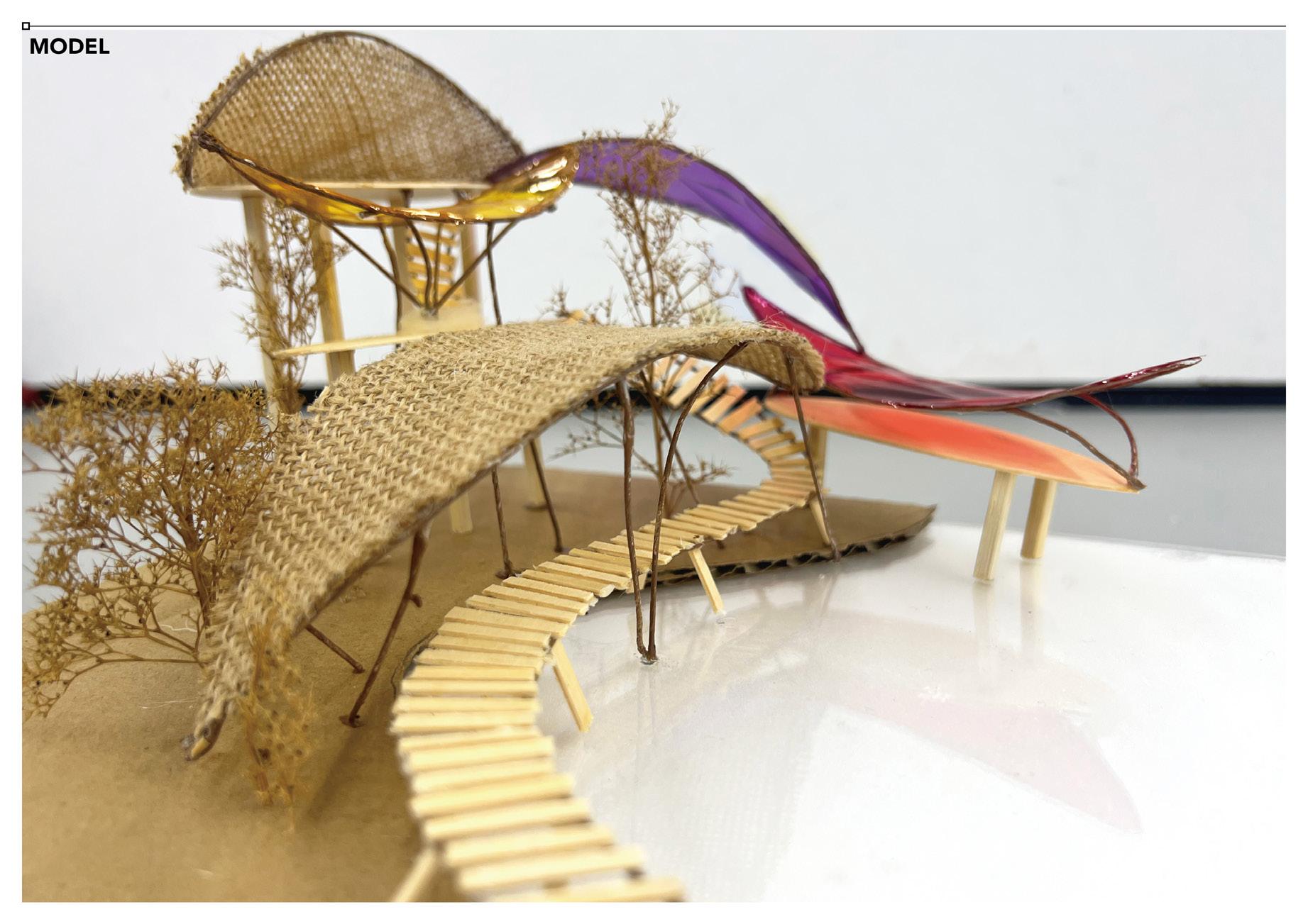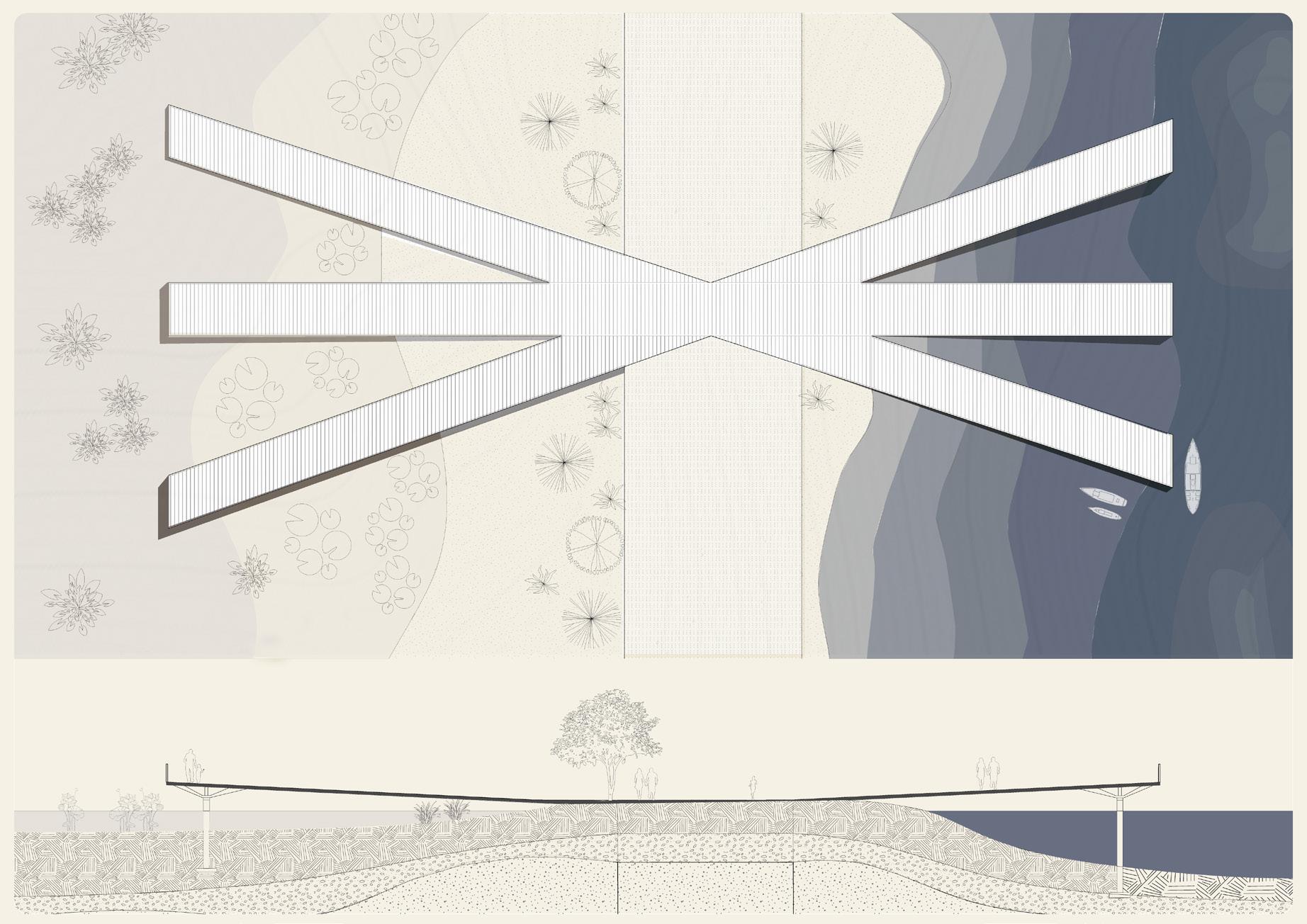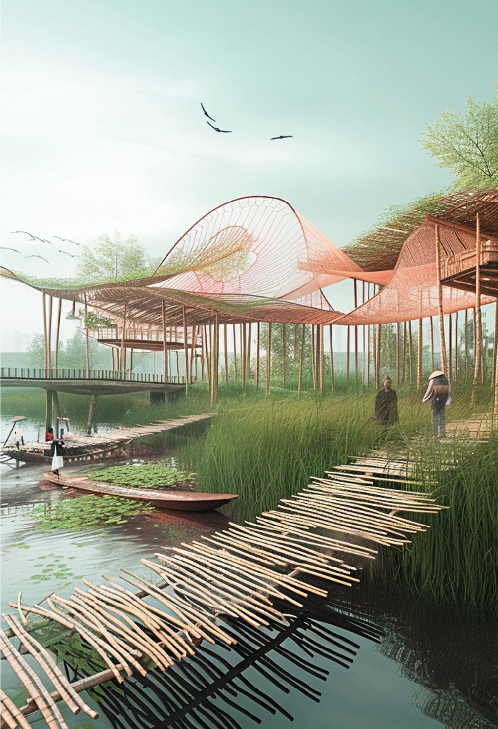 The bamboo bridge we are designing takes inspiration from the traditional "Monkey Bridge" found in the Mekong Delta region of Vietnam. It serves the dual purpose of allowing people to access a lotus pond and providing di erent levels for maintenance and observation.