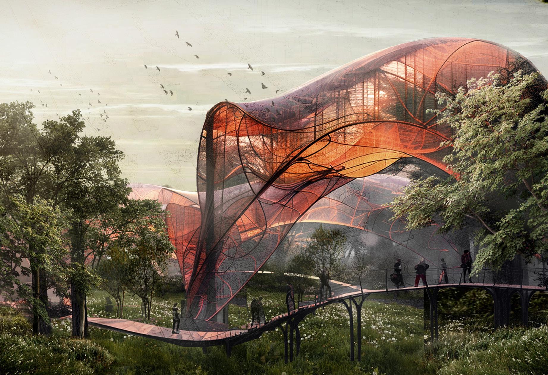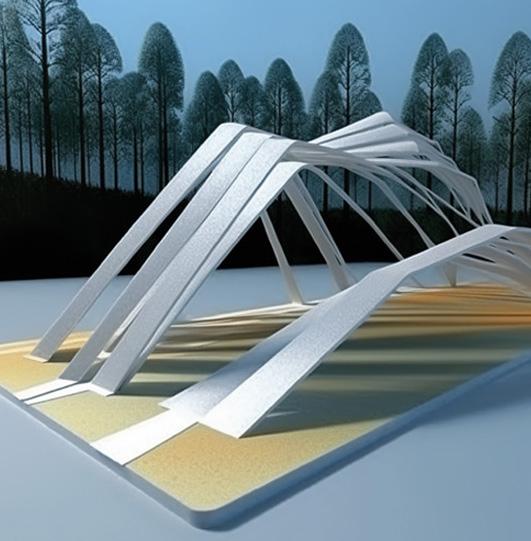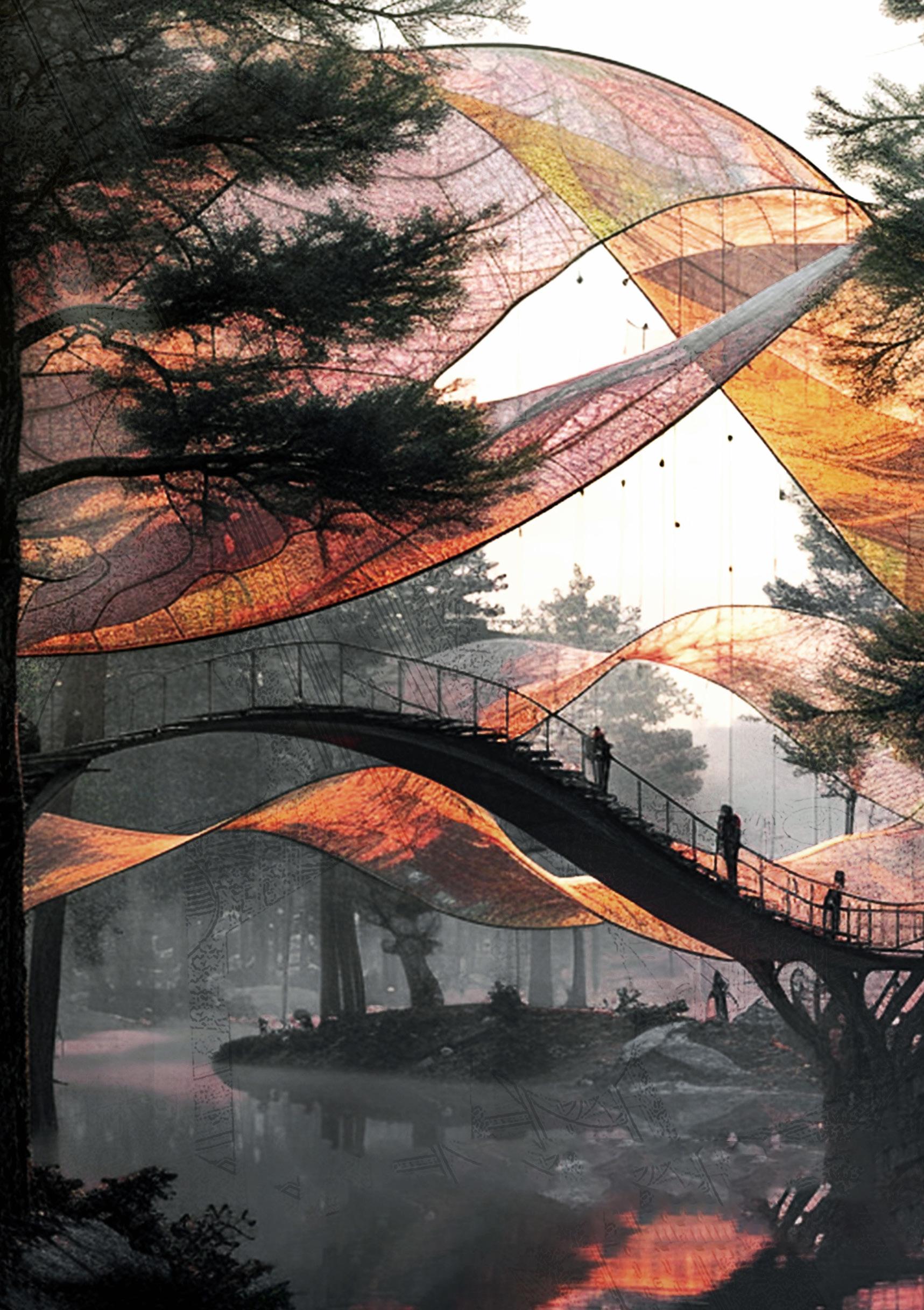 PROMPT: Bright sunshine in forest, Grassland, people Walking, Rigid, Tectonic, Smooth, Superstructure Stronger and More Curved, Bending Line, Angular Discounted Shape.