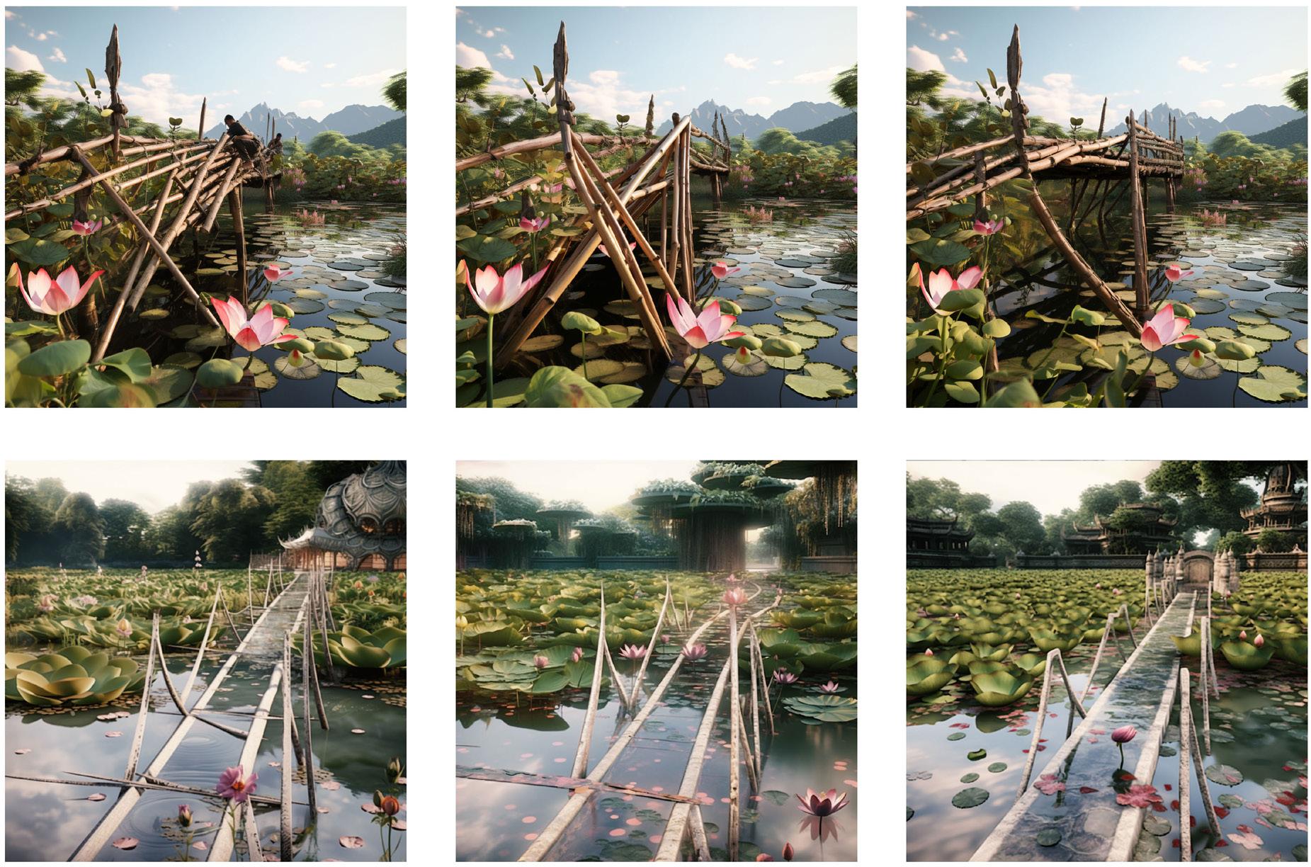 PROMPT: Perspective scene of the bridge and lake in Vietnam. In front is the lake and the forest path in the sunset, curved steel structures like silk, the bridge rises and falls, the height difference changesm people --v6.0