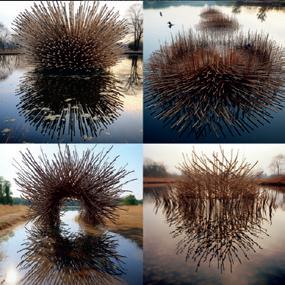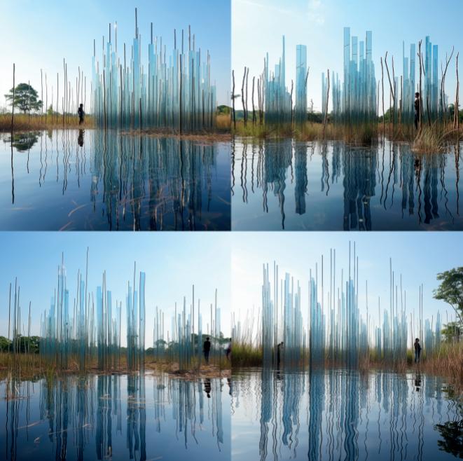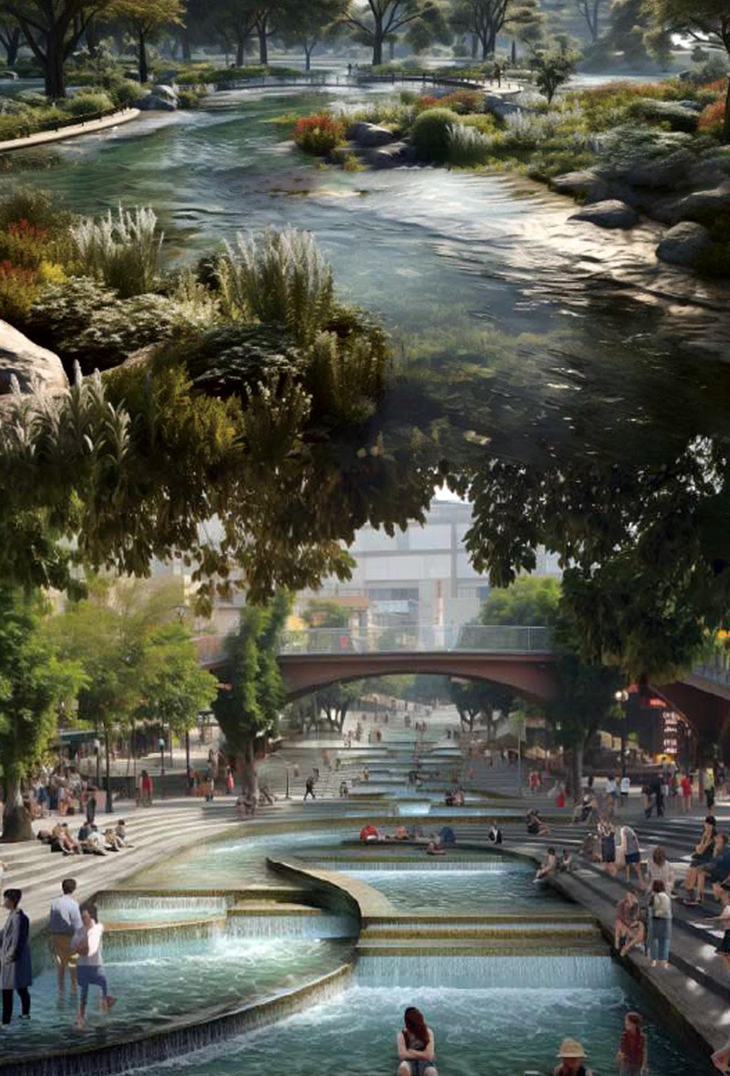 The project rendering of landscape water puriÞ ed by water features, realistic, layered forms, delicately detailed, Wide-angle view, 3D perspective, considered a masterpiece --no blocky--chaos 40
