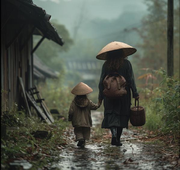 Vietnam agriculture land, swamps, add much more shrubs, add much more grass, add more trees, more plants on the water, at night time, raining scene, super heavy rain, storm, add more water drop, no mountain at the background, add more trees, tropical forest, cloudy, people walk on the road people stand under the structure, add birds on the structure