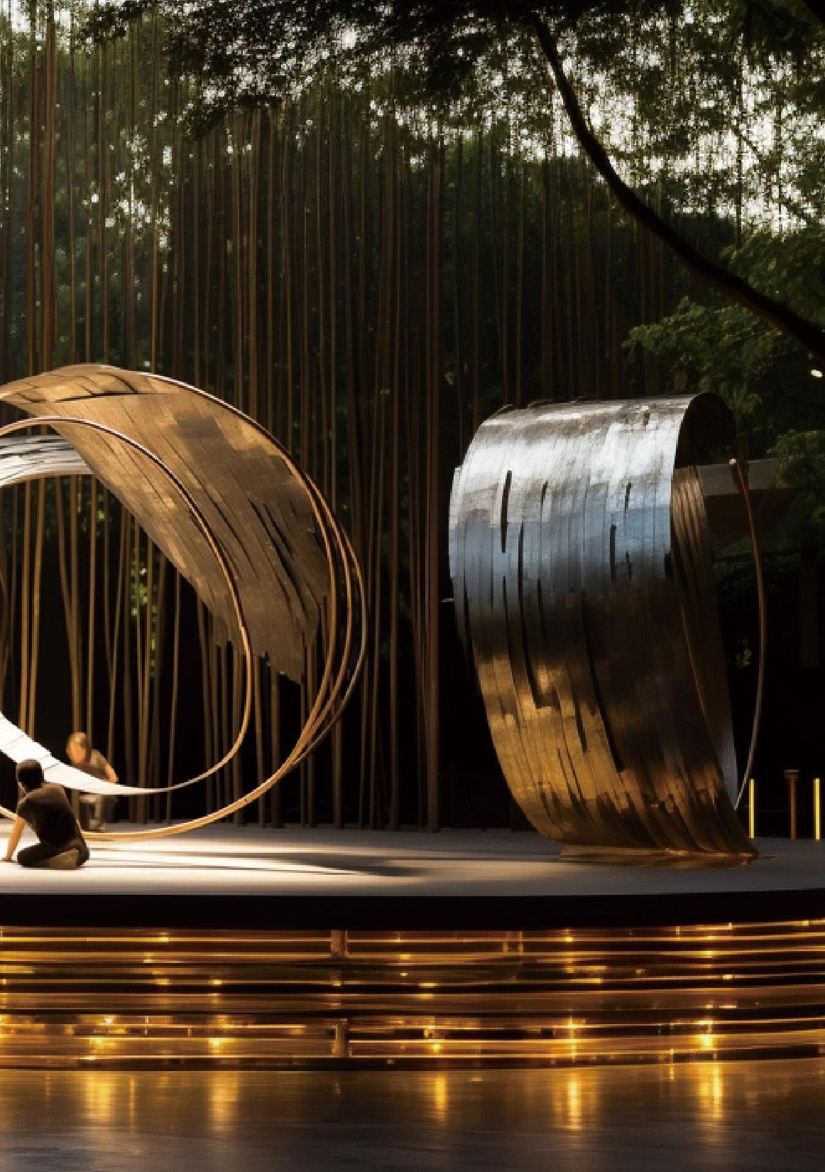 The concept of rhythm and dynamics is translated into the physical form of the landscape through the arrangement of stone slabs.