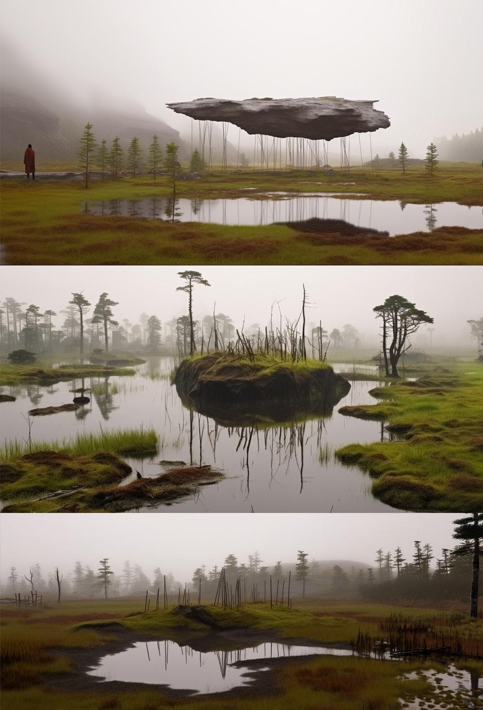 Landscape broken down into parts of the house, elegant, spatial, environments, traditional vietnamese, grid like structures, intricate cityscapes, lively tableaux, reality, land art, on swamp