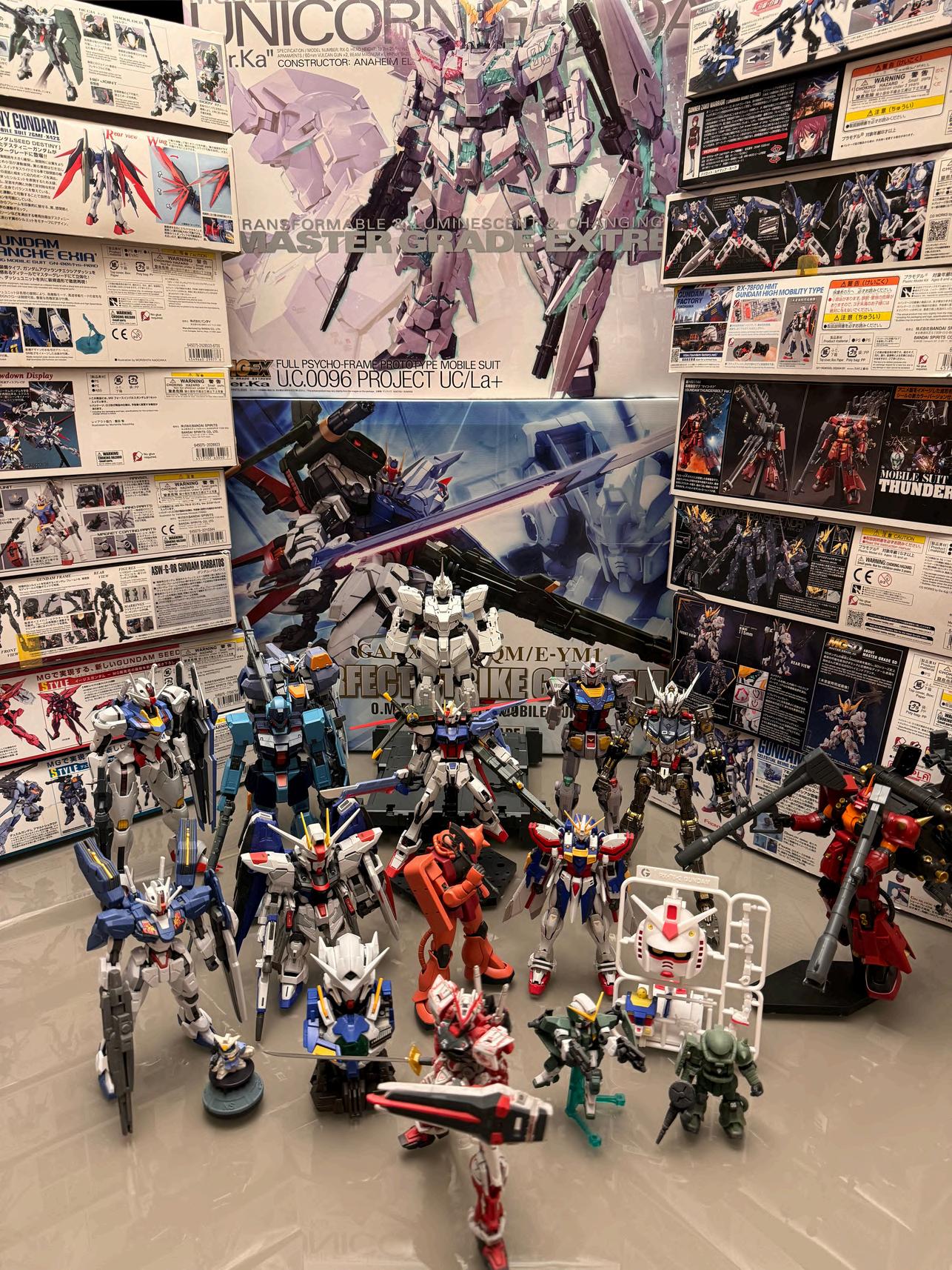 Enough pointless information though. Why should you read this guide? Well, I have many years of experience building Gunpla, and in my free time, I look at others’ builds and techniques to further improve my own skill Not even just in my free time, I used to watch it in class! (Not recommended for anyone else). I’ve spent hundreds, even thousands of hours, building and customising these model kits, refining my own skills to make sure the kits come out the exact way I want it to be. Above is a photo of some of the builds I’ve finished or are still in WIP!