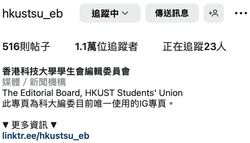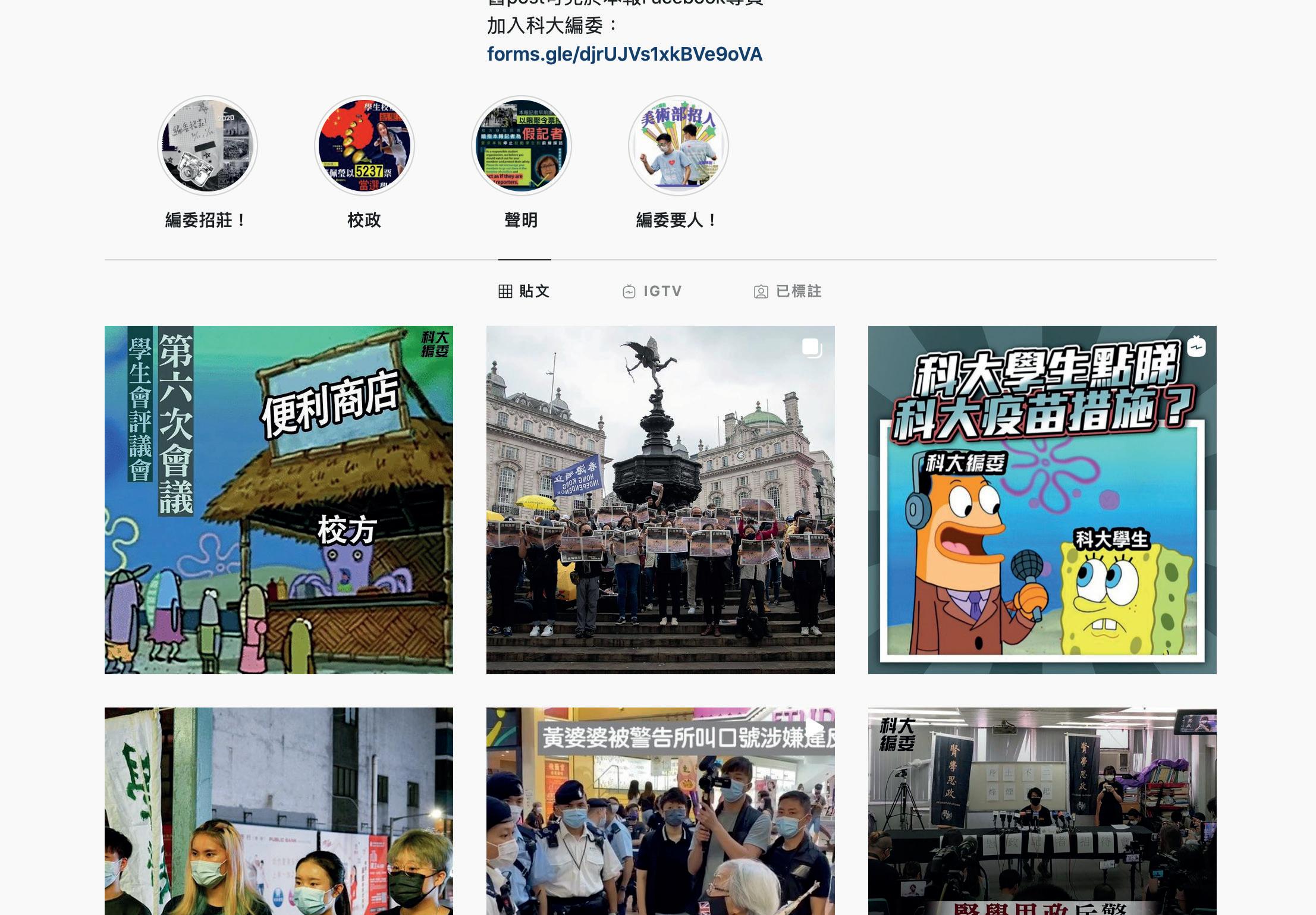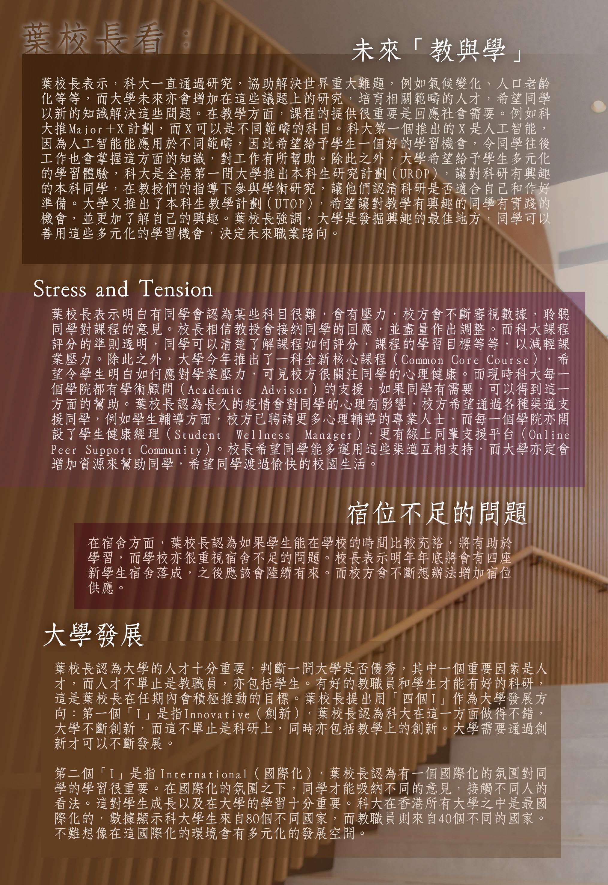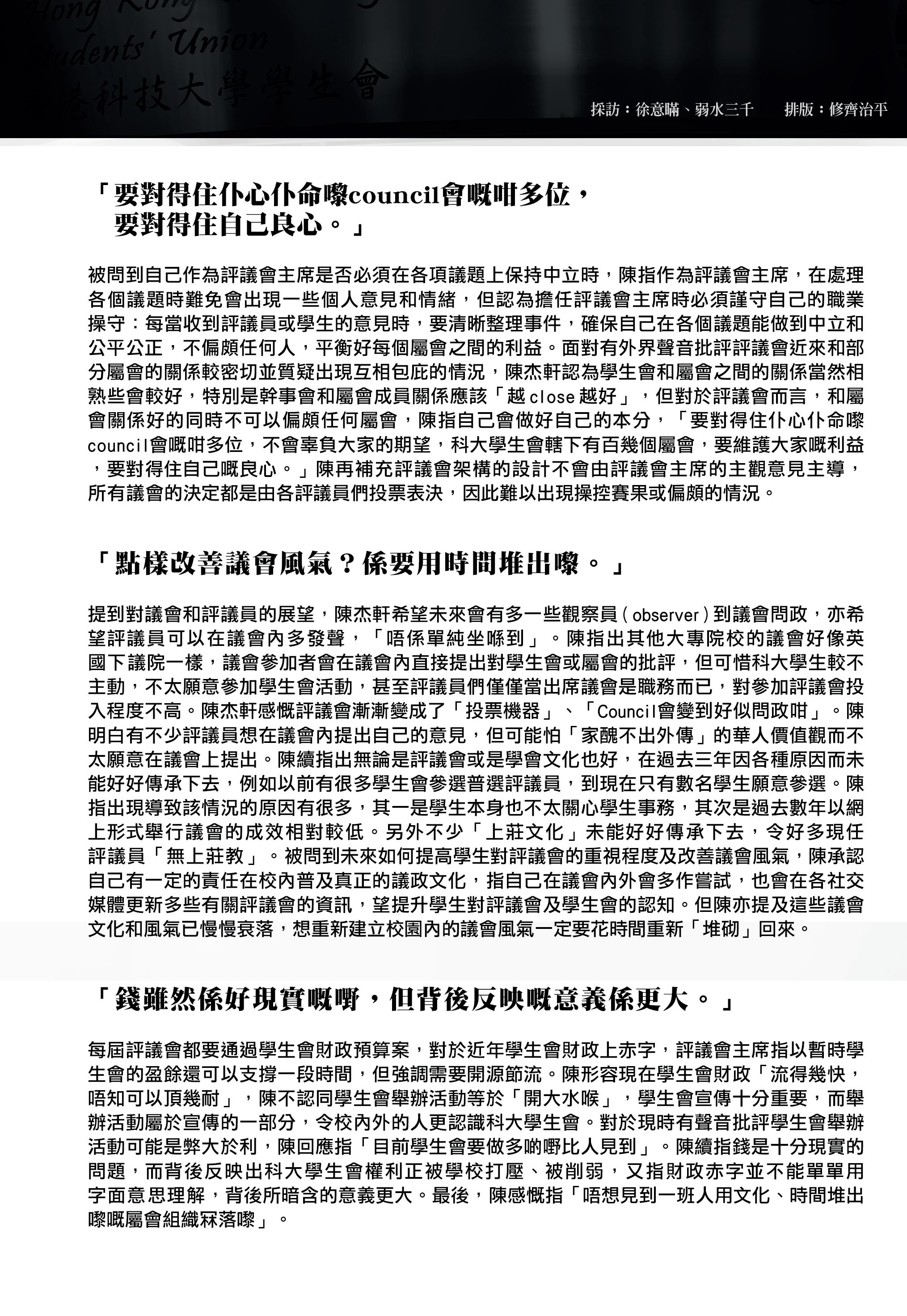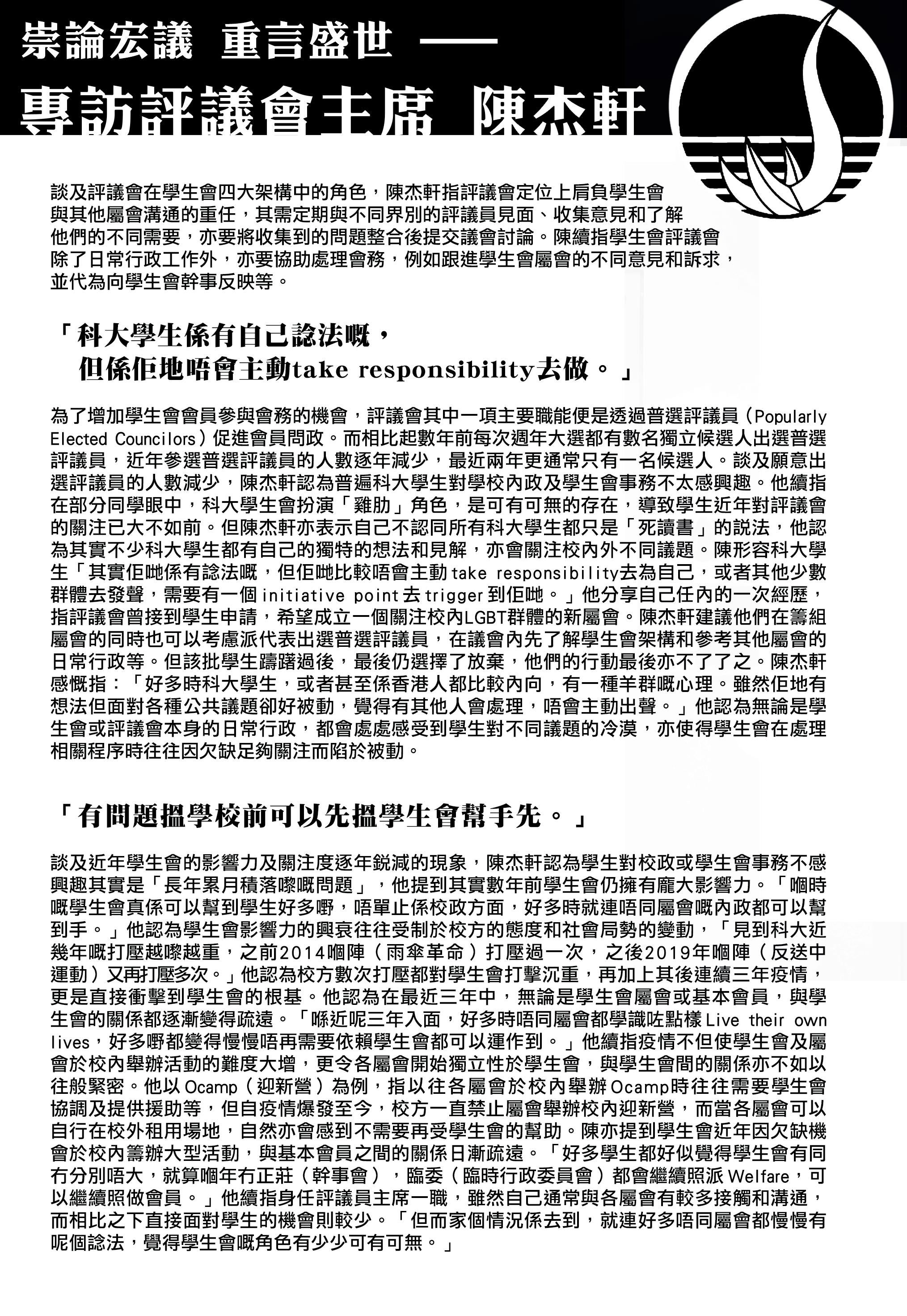 「分崩離析」之際,繼續如以往般投 放大量資源在外務上已經沒有太大意 義。他認為學生會不僅是代表着大學 生,外務上更是以社會上的知識分子 身份參與推動社會變革,有義務就社 會不同議題發聲,但同時亦要平衡風 險和責任。談起科大學生會在學界的 定位,他提到在資源不足的情況下, 只能集中資源服務好學生,盡量處理 好校政事務為主。