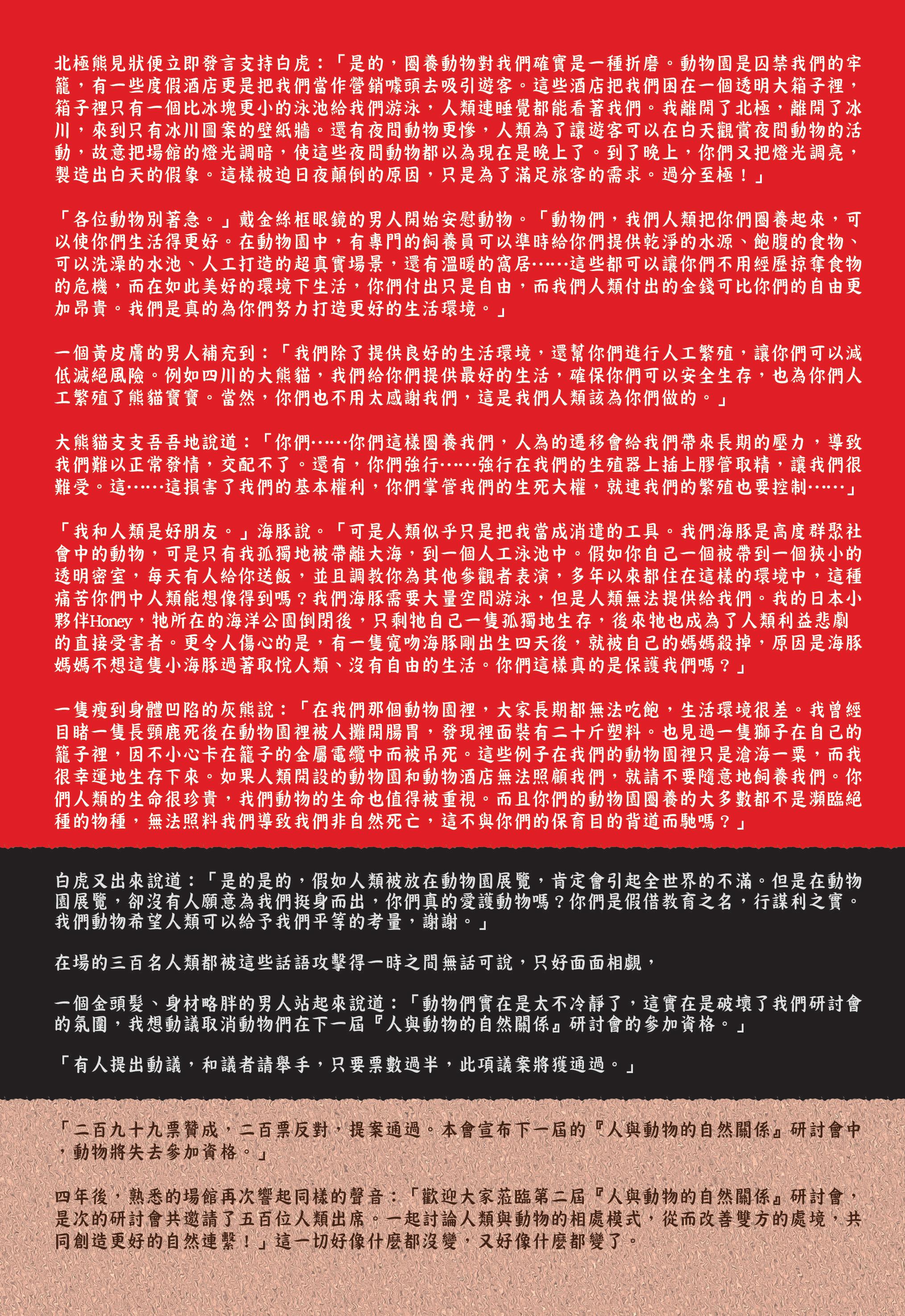 到㡳我在餘下的人生中,何時才能失去心 中餘下的清醒,感受到愛上加害者的快樂 呢?我也想患上斯德哥爾摩症候群,比起痛 苦地保留自我,或許扭曲意志的快樂更能 讓人解脫。