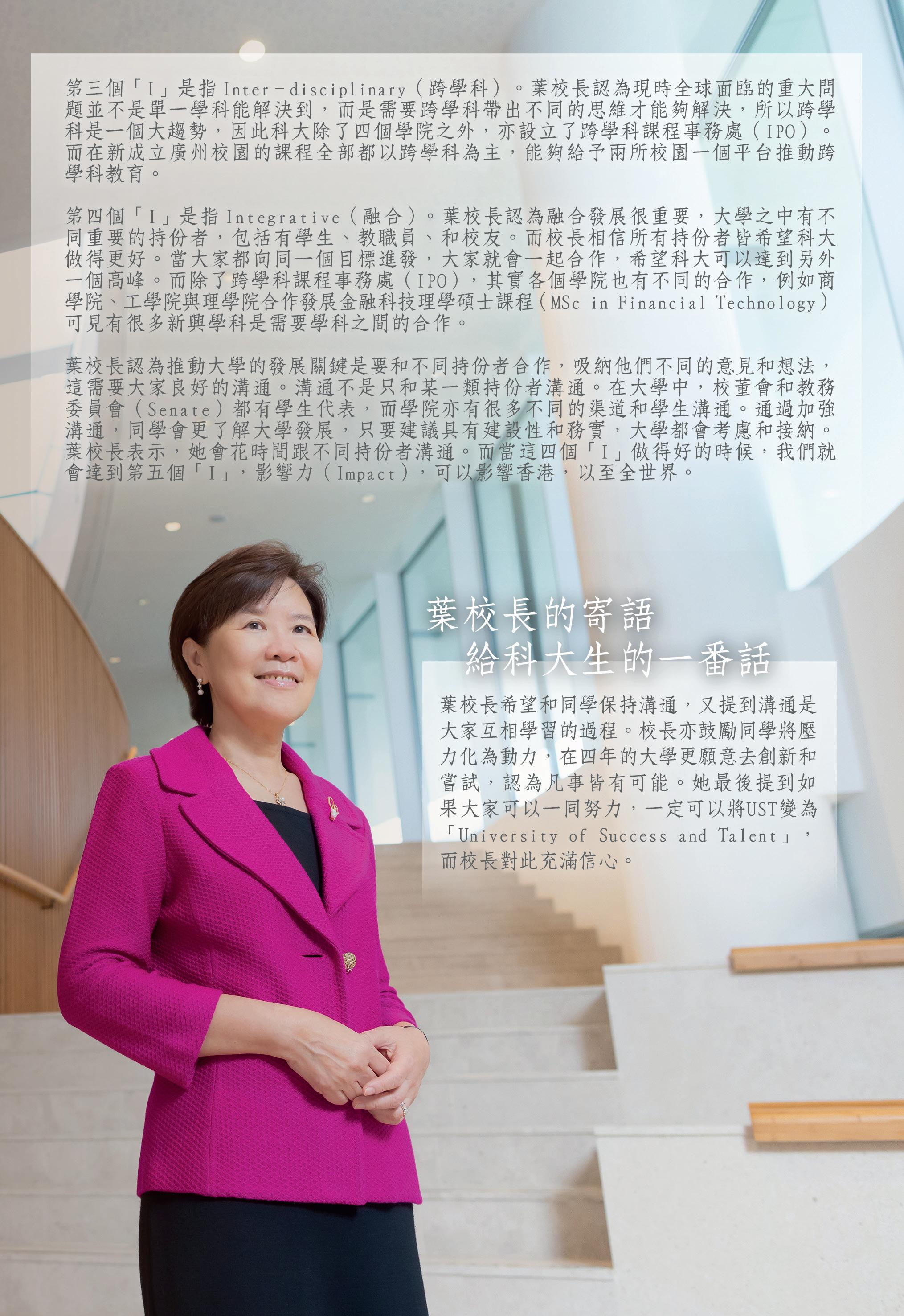 史教授希望看到科大學生能夠具有創業精神,可以跳出 框架思考,不被既有的思維束縛。他指當中的關鍵是取 決於態度,而不是職業或事業。科大的學生和教職員來 自世界不同地方,各種文化和觀點在校內交織,大家應 互相尊重並促進多元共融,透過交流及溝通,互相學習 借鑒。他當時的角色是盡其所能,不論是多數抑或少 數,人人皆可自由發表意見。史教授亦期望科大日後可 以繼續保持開放風氣,以利思考和探索。