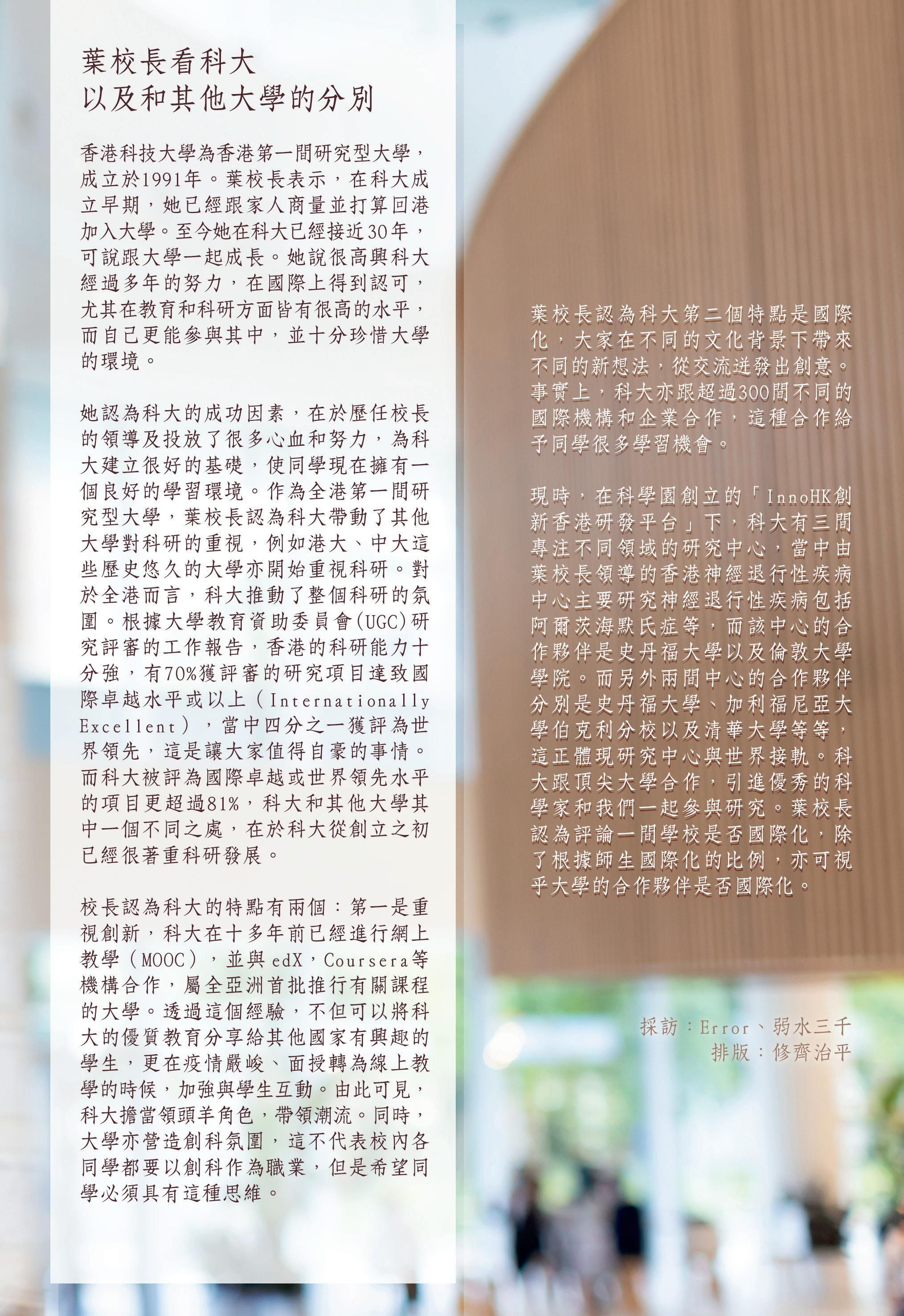 以上是筆者認為科大柒大可改善之處,還望可以為各位同學帶 來啟發,亦希望其中內容可以引起各位些許共鳴和思考。然若 僅得筆者一人一文,實在人微言輕,相信校方亦會對這篇文章 不以為然,更遑論會有任何跟進行動。路阻且遠,唯有透過諸 位的投入和推動,或許才能在未來為科大帶來一絲改變。 撰文:Error
