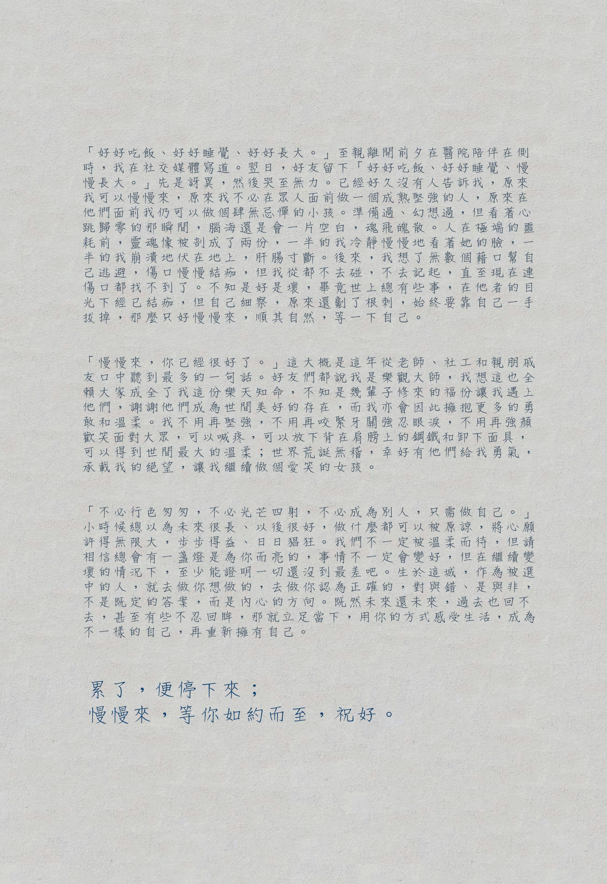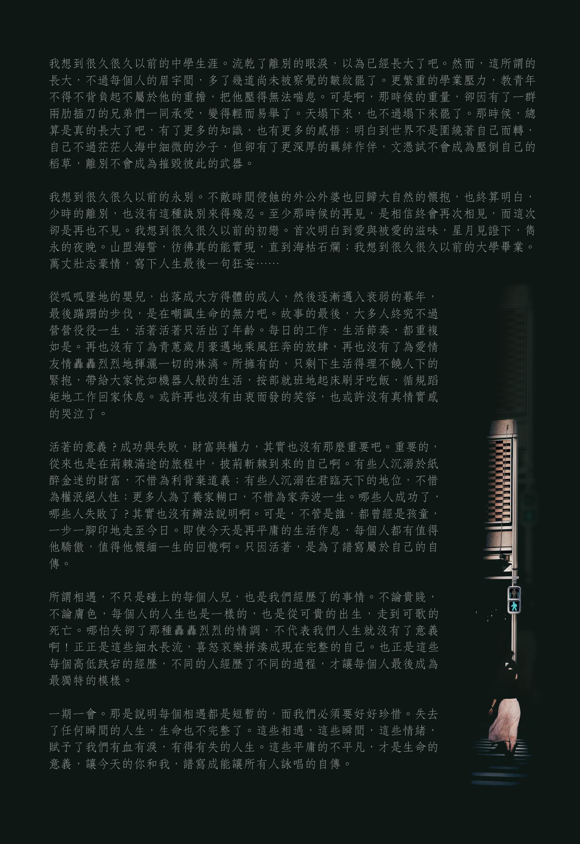 這番話來自一群中年大叔的交談。十五歲的我聽到後,更多的是錯愕。為 什麼要將人的思念和悲傷貶得一文不值呢?雖然有這個想法,但坦白說, 或許我的不解是源自於那時的我根本不了解分袂到底有多沉重,因為整場 的葬禮,我沒有流過一滴眼淚、沒有感到一絲悲傷,甚至不明白親人們的 痛哭流涕。而二十歲的我,在離別多了後,終於開始領悟這句話背後的意 義: