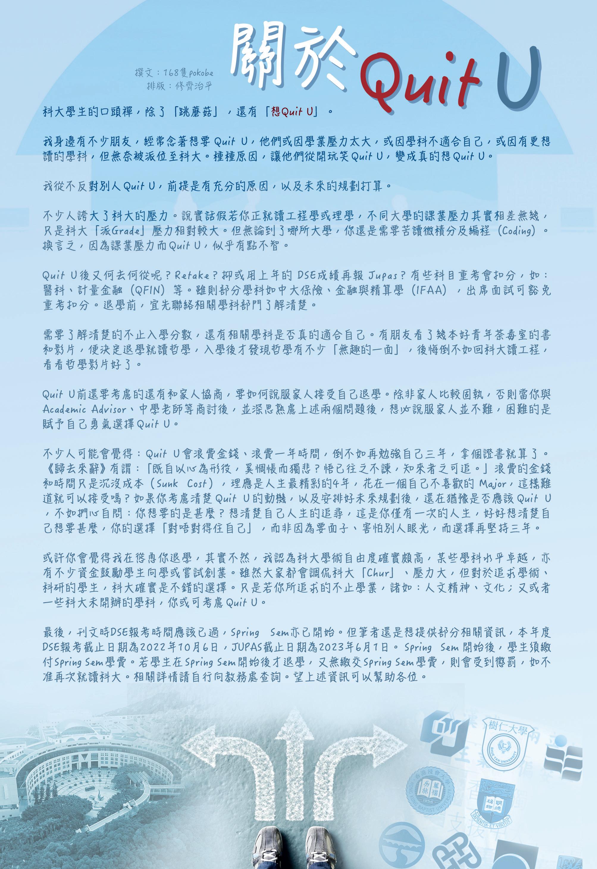 大學是要讀書的,除非你是天才,或是完全不在意成績 的學生,否則所有跟你說「上了大學就等於上岸」的人都是 騙你的。然而,讀書是不是就是學生的全部呢?全港八大院 校加上其他大專院校的學生都要讀書,但談到chur的程度, 其他院校又則未必及得上科大。當然,科大毋容置疑地在全 港,甚至不少國際大學排名上都獲得相當不俗的成績,而這 或多或少都要歸功於長期爆滿的自修室。但是排名背後,科 大同學付出了多少代價、承受了多少壓力、又有多少學生的 精神健康出現問題?儘管科大有提供精神健康及情緒輔導服 務,但往往預約需時,導致有需要的學生難以及時獲得恰當 的幫助。這可能是因為輔導員的數量不足,又或是需求真的 太大,增設再多的人手也無補於事。