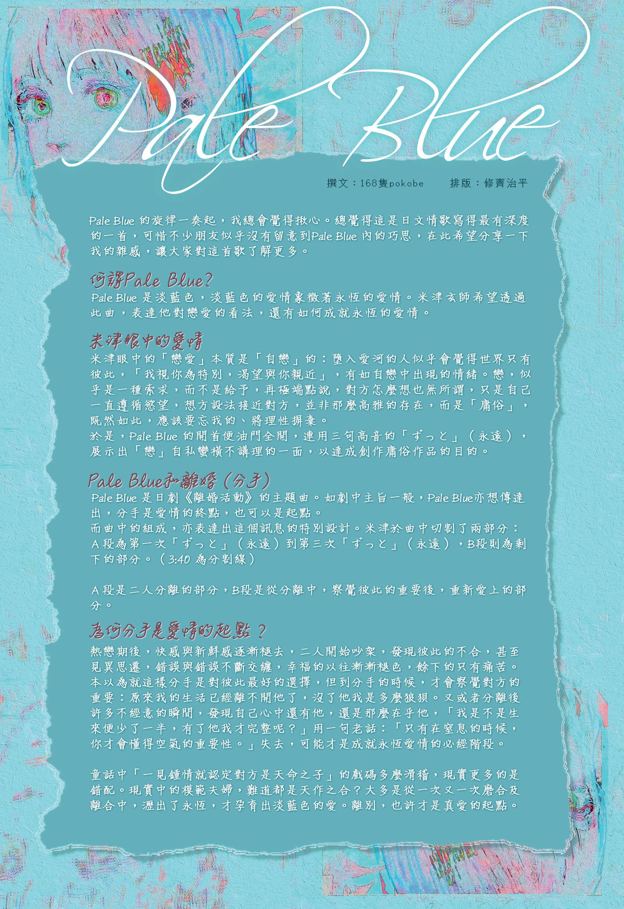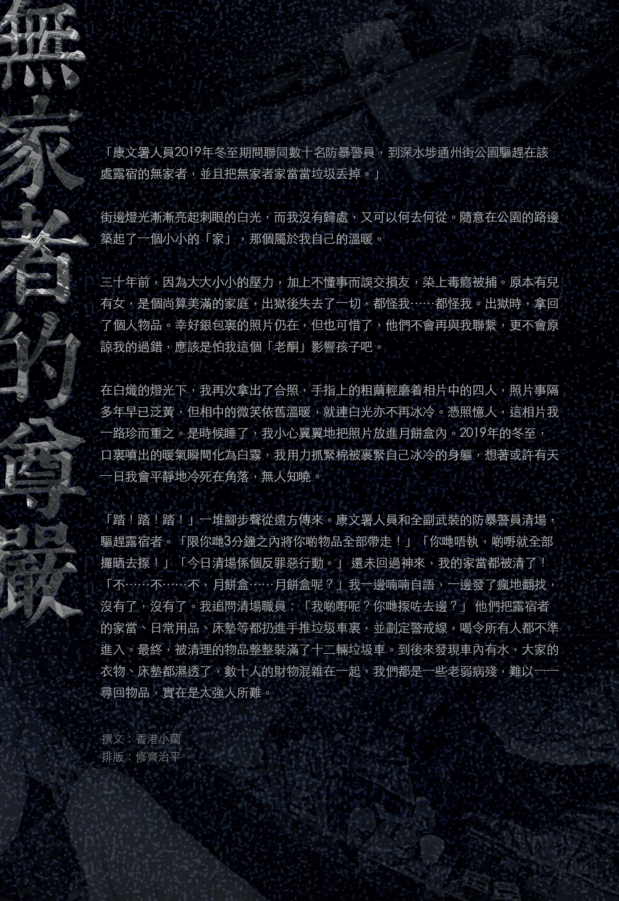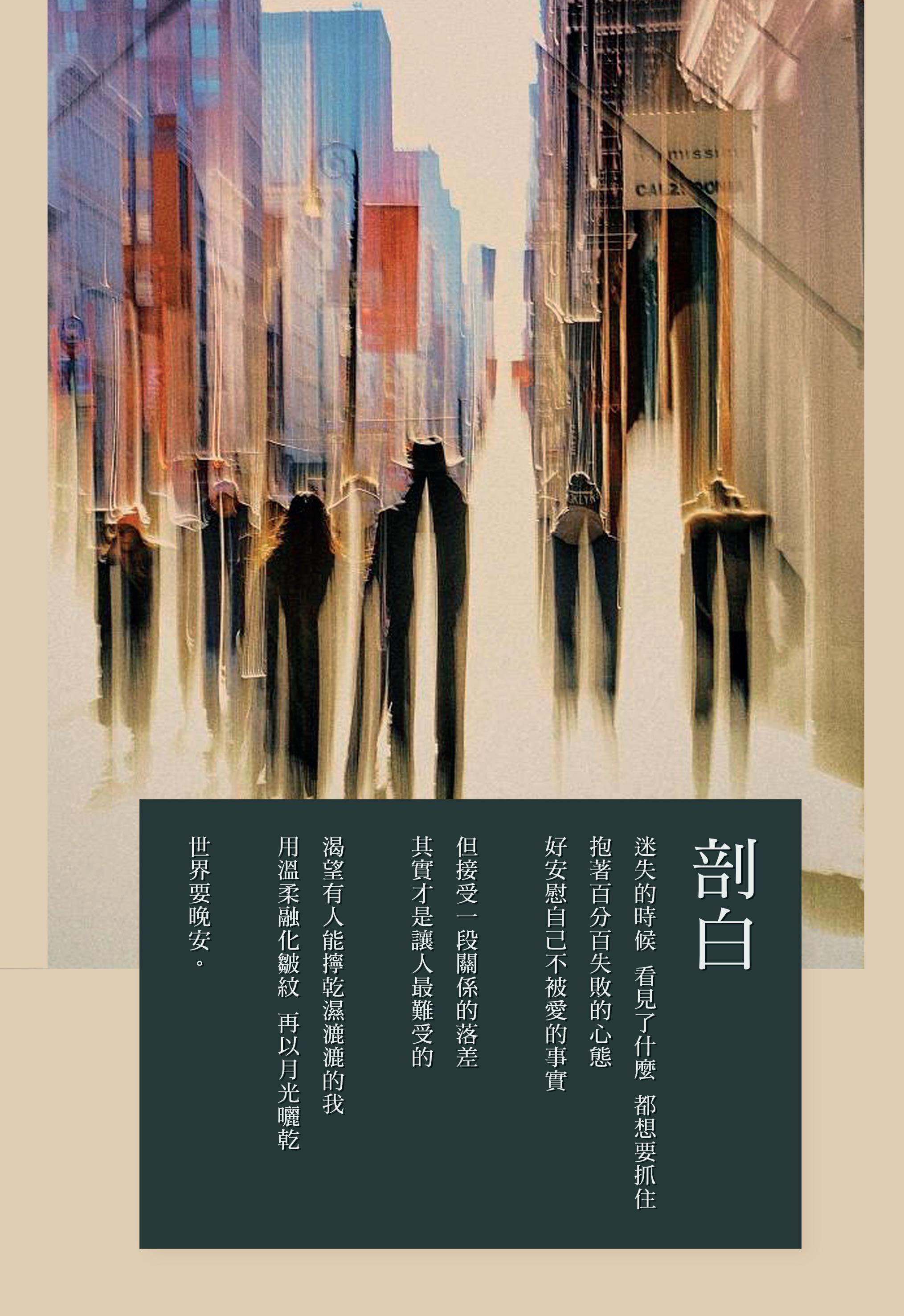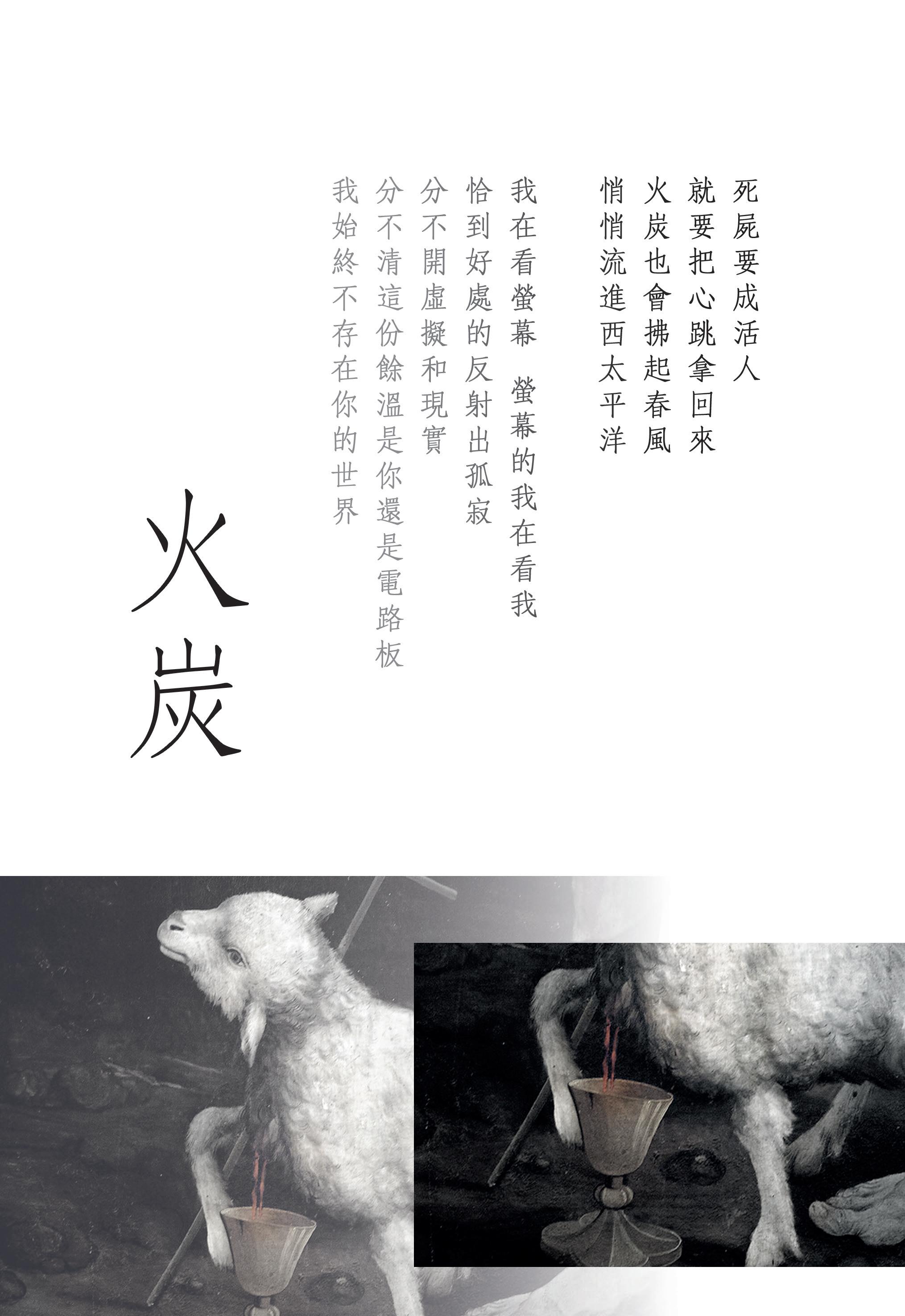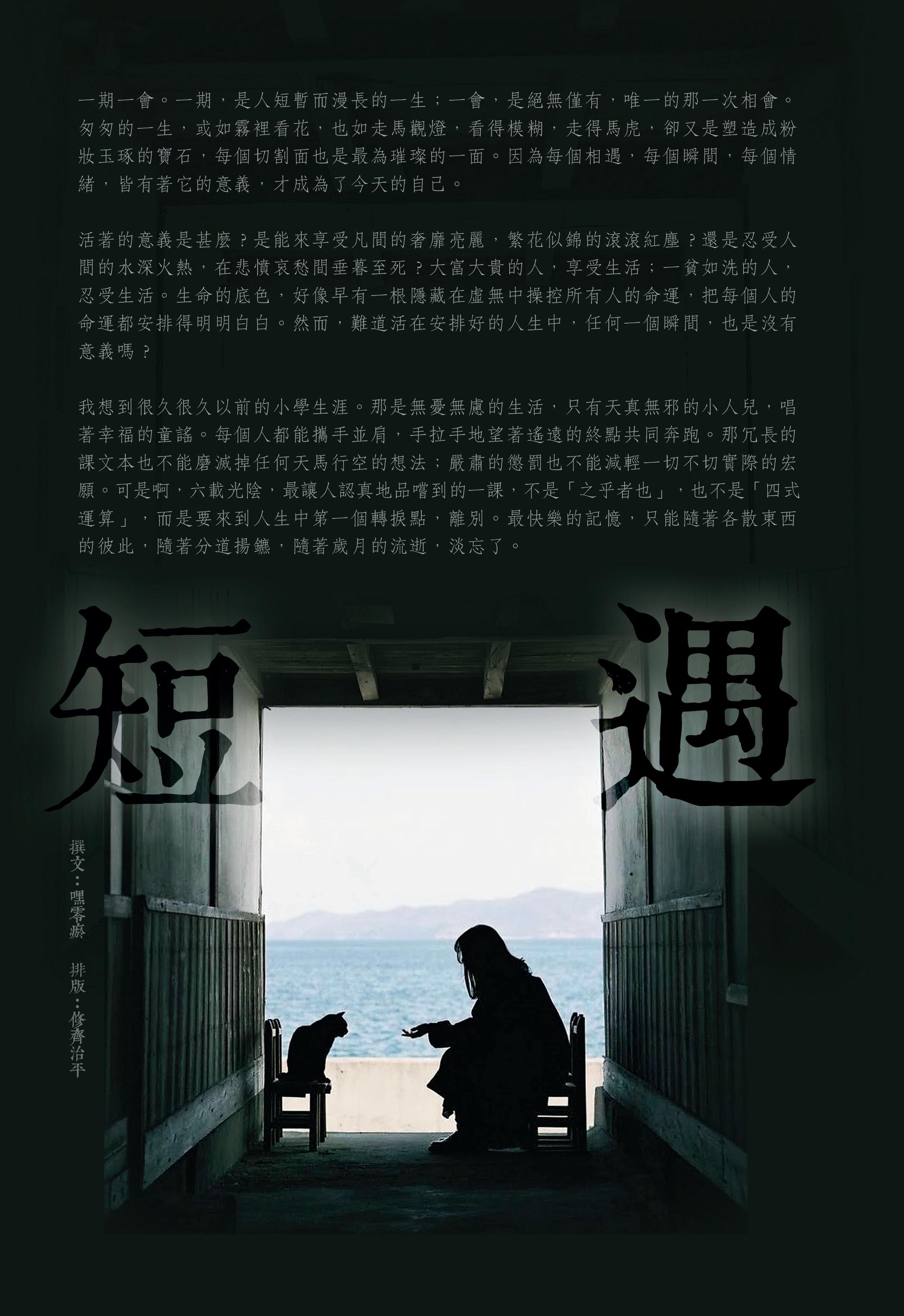 從不遠處的上方不時傳來間歇的躁動。那是專屬於 年輕人的活力吧 一名已至耄耋的老人睜開眼,縱使 隔着一層深淵似的水流,仍可隱約看見數個黑影在上方 的亂流中掙扎撲騰着,徒勞無功地與始終不可逆的漩渦 搏鬥着。老人翻身別過臉,他不能理解這一切的意義。 他也曾想像過漩渦之上那美麗光景,但身上的傷痕和歲 月卻早已磨去了一切鬥志。閉上雙眼,他躺平的身軀在 渦流中載浮載沉。這樣或許還能下沉得慢一些呢-老人 這麼想着,再次沉沉睡去。