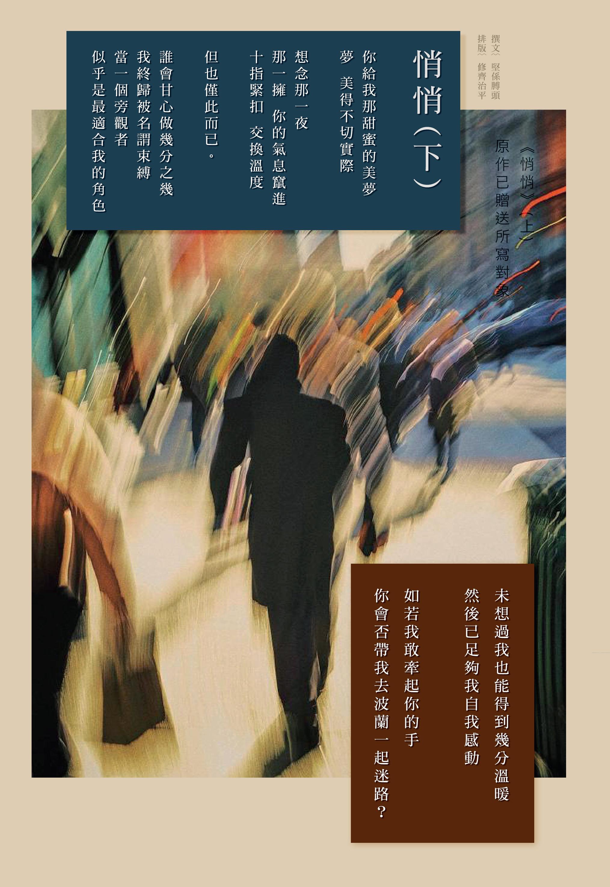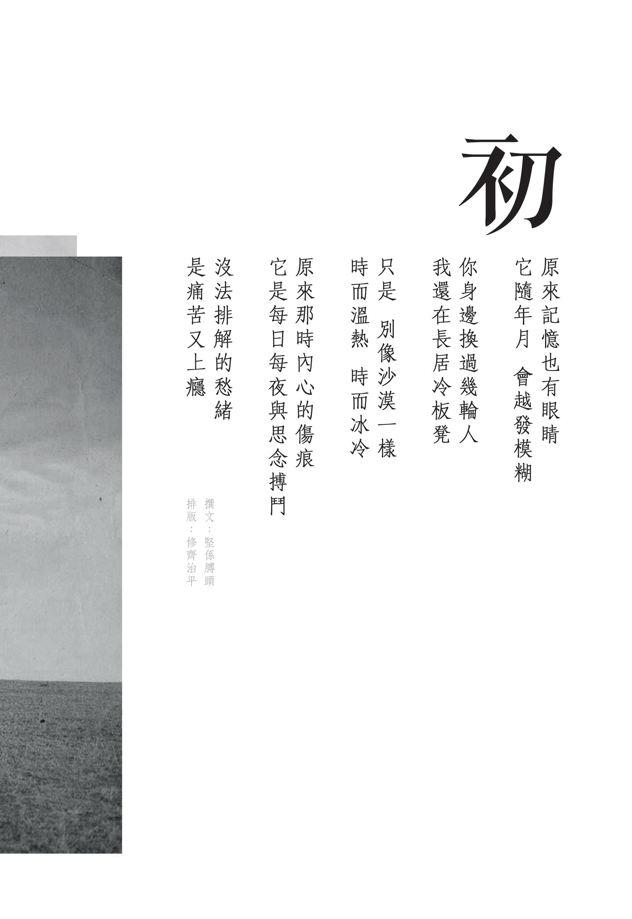 我們每人無不經歷過離別,大至親人離去、情人分手、朋友絕交;小至畢 業分散、聚會結束、旅行完結。聚,總會伴隨著散。可笑的是,大家的人 生都是由散組成,散得越多,人生反而更豐富。這份矛盾讓我們雖痛, 但感覺活著。不過,其實我不喜歡將生命中的離別叫做 散,每個人唯一的散,就是當自己走到生命盡頭的時 候。而那些生命中的離別,只是為我們添加一些色 彩,提醒著我們活著的價值,並為我們帶來下一個 聚。