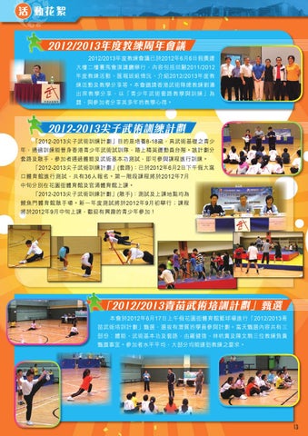 2012-2013尖子武術訓練計劃 「2012-2013尖子武術訓練計劃」目的是培養8-18歲,具武術基礎之青少 年,通過訓練能晉身香港青少年武術試訓隊,踏上精英運動員台階。該計劃分 套路及散手,參加者通過體能及武術基本功測試,即可參與課程進行訓練。 「2012-2013尖子武術訓練計劃」(套路):已於2012年6月2日下午假大窩 口體育館進行測試,共有36人報名。第一階段課程將於2012年7月 中旬分別在花園街體育館及官涌體育館上課。 「2012-2013尖子武術訓練計劃」(散手):測試及上課地點均為 鯉魚門體育館散手場。新一年度測試將於2012年9月初舉行;課程 將於2012年9月中旬上課,歡迎有興趣的青少年參加!