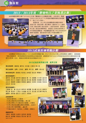 2012 /2013年度「體壇明日之星甄選計劃」 由香港體育學院主辦「2012/2013年度『體壇明日之星甄選計劃』- 武術項目」甄選 已於2013年2月2日下午2時假香港體育學院武術場舉 行,吸引了67人報名。 經選拔後,26人符合武術運動員訓練基本條件, 並進行第一階段為期一個月集訓。最終有13人入選進 行第二階段為期三個月試訓。三個月試訓後,達到並 符合第二階段訓練標準者,便能進入香港武術隊青少 年有潛質組運動員。希望獲甄選的青少年在武術項目中 發揮天賦潛能,藉此提高本地青少年競技運動水平。