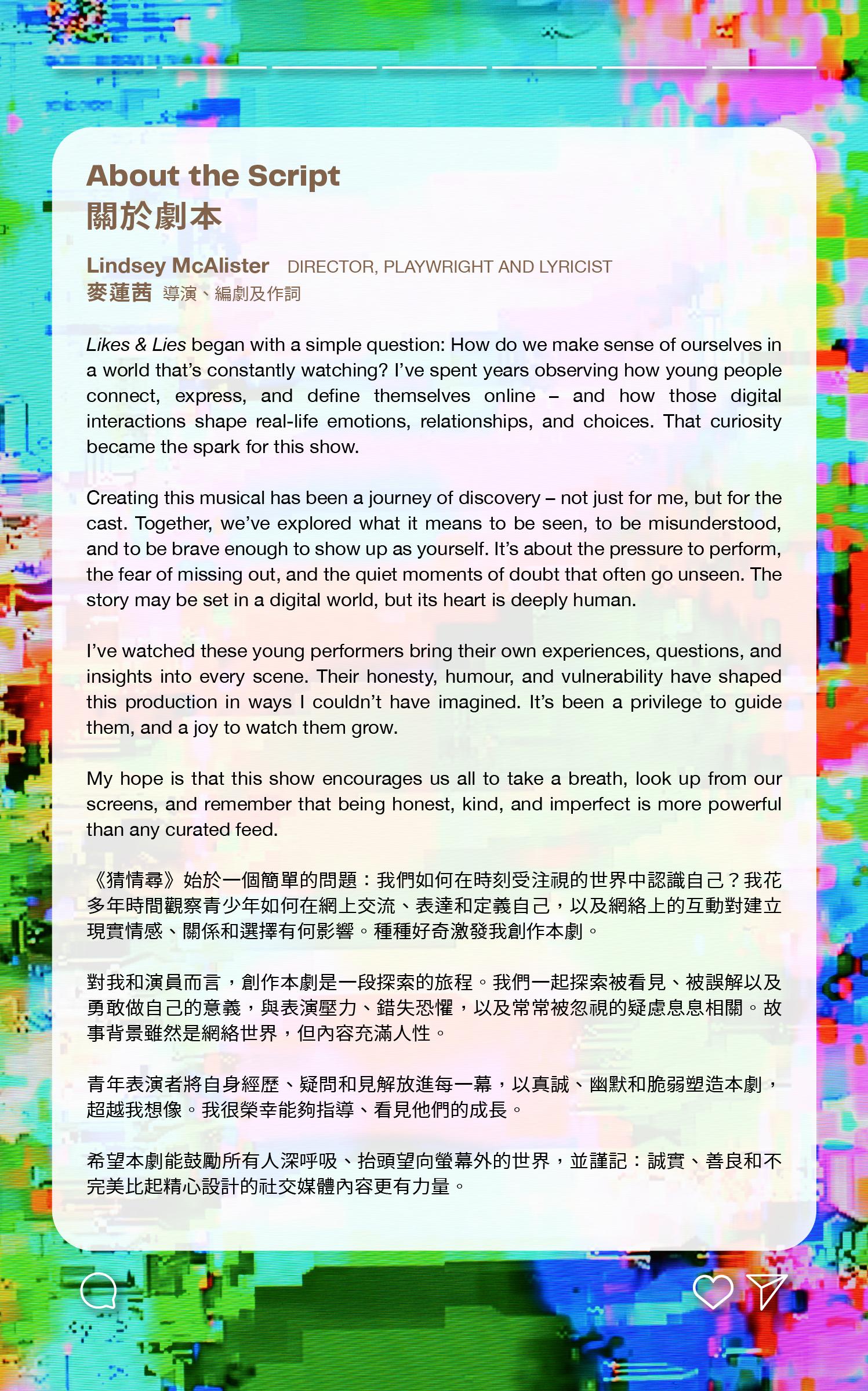 Likes & Lies – this year’s flagship youth musical production – tackles issues around online integrity. Performed by young Hong Kong performers aged 9 to 25, written and directed by Lindsey McAlister, founder of Hong Kong Youth Arts Foundation, and with original music by multi-disciplinary artist Amuer Calderon, Likes & Lies is co-presented and co-produced by WestK and HKYAF.