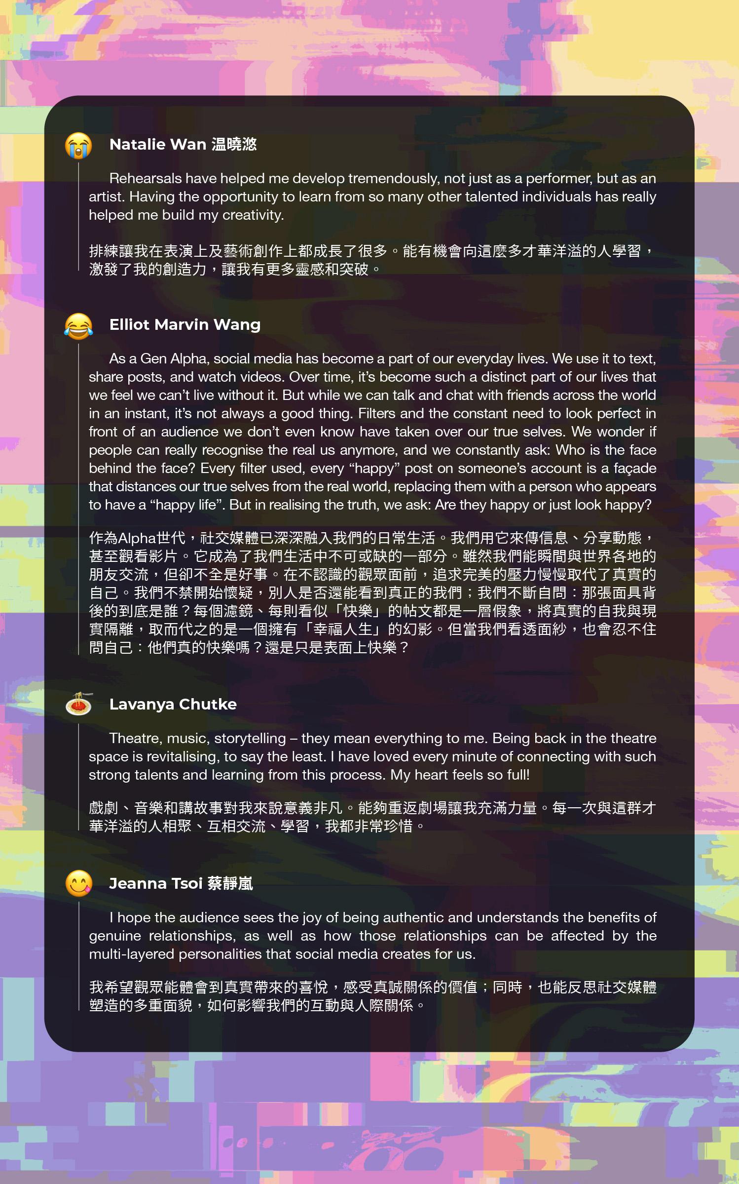 音樂劇由香港青年藝術協會創辦人麥蓮茜(Lindsey McAlister)創作和編導,Amuer Calderon創作原創音樂,並由九至二十五歲才華橫溢的歌者、舞者和演員演出。作品以另類的方式來邀請年輕人反思社交媒體在生活中扮演了的角色及真實性,引起年輕人的共鳴。