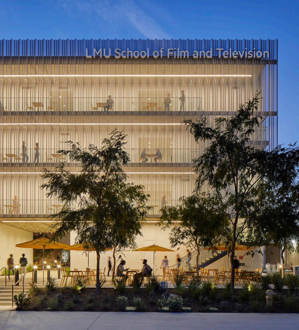 The distinctive layered architecture of the Loyola Marymount University School of Film and Television offered a unique canvas for lighting design that pays homage to the drama and magic of visual storytelling. By day, the building’s perforated brise-soleil casts soft shadows over the external corridors, creating shaded gathering spaces for students. At night it seemingly evaporates, transforming into a luminous “silver screen” that reflects the energy of student movement and symbolizes the school’s deep connection with the broader campus.