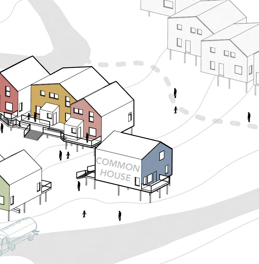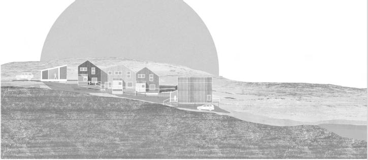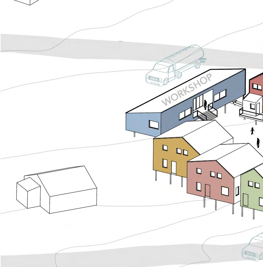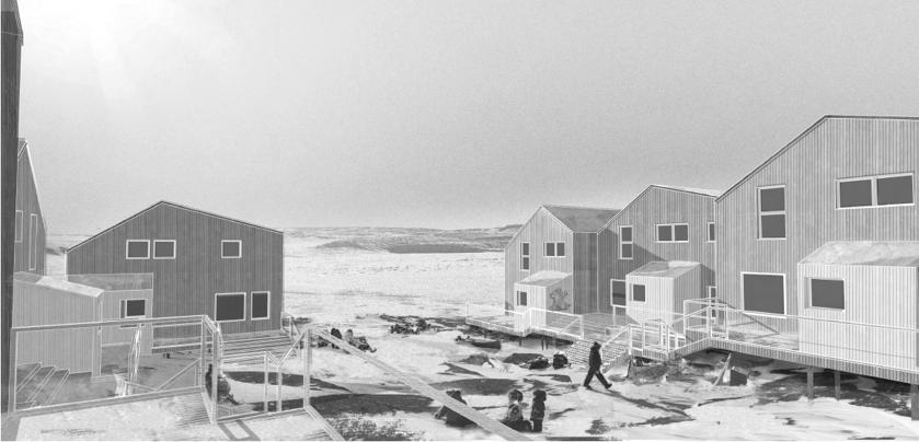 Diversity of housing types: detached houses, duplex, apartments and elders residence. Photo credits: Symbiose territoriale (à Kangiqsualujjuaq), ARC-6039 Projets de design urbain (2020) Sandrine Arguin-Marchand, Dominique Pichette, Florence Gagnon, Anthony Présumé Design: S. Arguin-Marchand, D. Pichette, F. Gagnon, A. Présumé (2020) hunting, fishing and traveling equipement rental elders residence + common house with shared spaces utilidors under decks food production: greenhouse, henhouse, community freezer towards the land towards the village