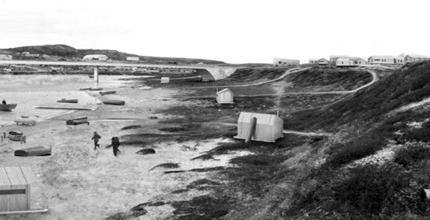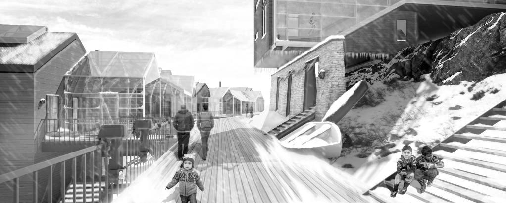 0m 0 m 400 400 800 800 1200 1200 1600 1600 living together seasonality imagibility mixity contactwiththeland c omfort& optimizatio n Inukjuak Nunavik • New dwelling type features large enclosed porch inspired by Inuit kayak construction. • Houses made of recyclable materials rise above platforms to minimize impact on the land. • In warm weather, porches open up to increase living space. It also provides a sheltered connection to the land and an insulating ‘‘buffer’’ for the living spaces during the harsh Winter. Photo credits: (Left) https://mobile-img.lpcdn.ca/lpca/924x/r3996/e7b56e68-e995-11ea-b8ad-02fe89184577.jpg https://issuu.com/hlnq.linq/docs/imaginer-imagining, pp. 34-37. 58°N 11 dwellings/ha (net) utilidors emerging 1 821 (2021) +191 bedrock utilidors and storage underneath platforms and walkways preserved land for activities adapts to topography connection to the street (shared parking)