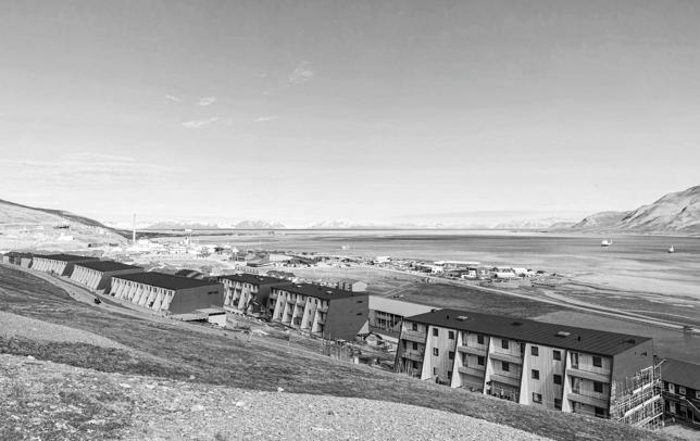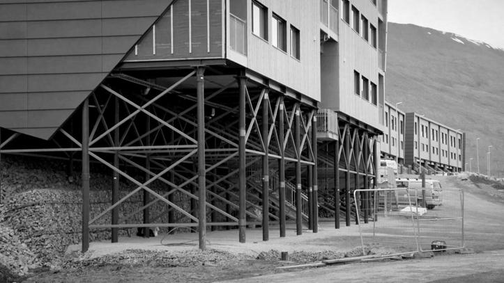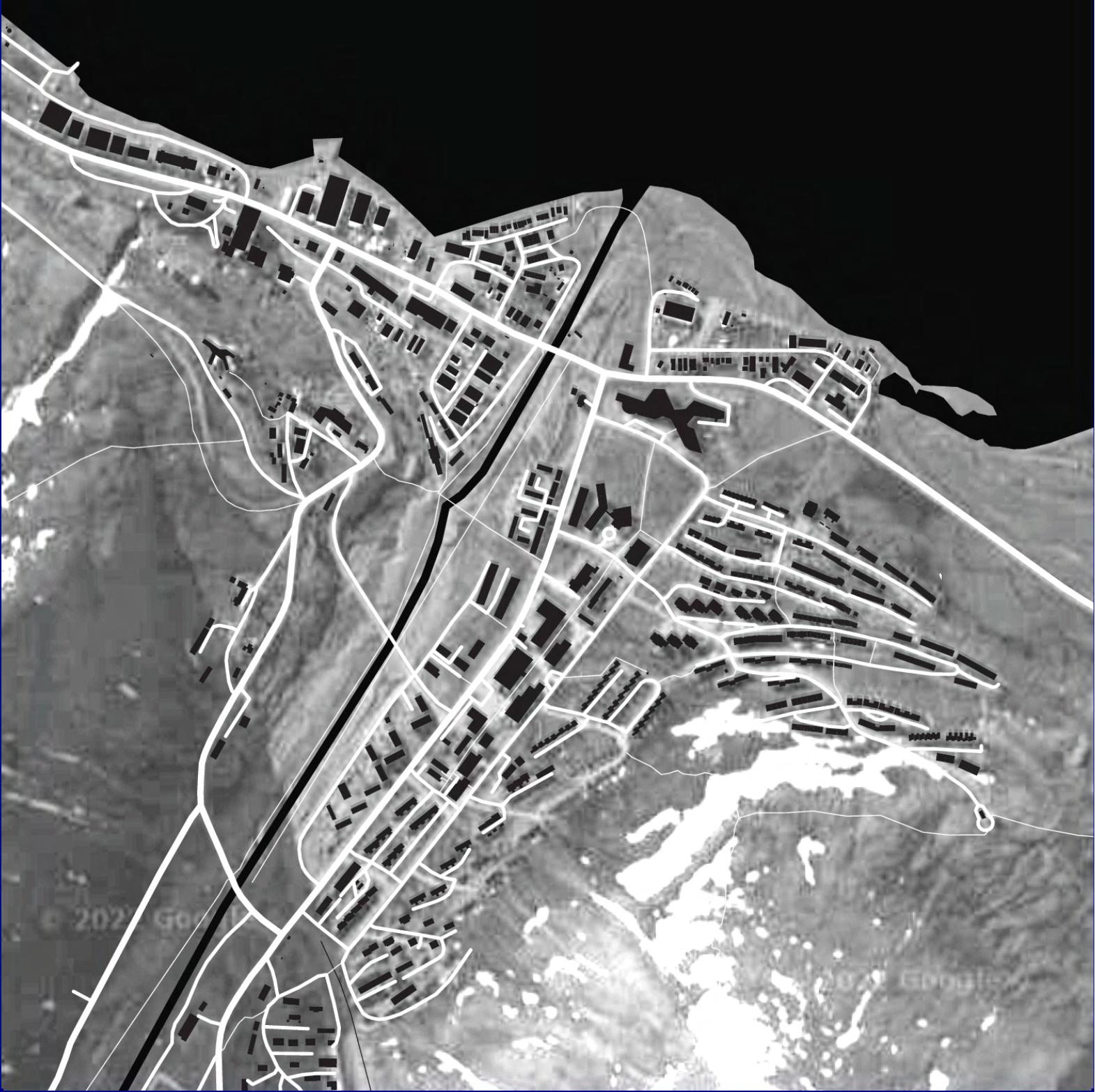 the bedrock. Photo credits: (Left) https://polarbearsinternational.org/news-media/articles/svalbard-norway-climate-action-outreach (Center) https://www.bbc.com/travel/article/20200301-rebuilding-the-worlds-northernmost-town (Right) https://group.skanska.com/media/articles/in-a-changing-arctic-adapting-buildings-and-ways-of-life/ roads following the topography utilidors wind shelther grouping enveloppe optimization retaining wall steel