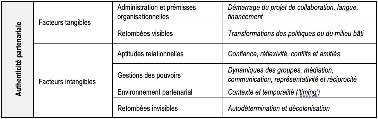 Partnership authenticity is characterized by the legitimacy and success of the collaborative research process. It uses tangible and intangible factors (summarized in Table 1) that