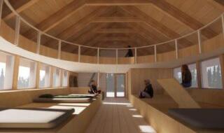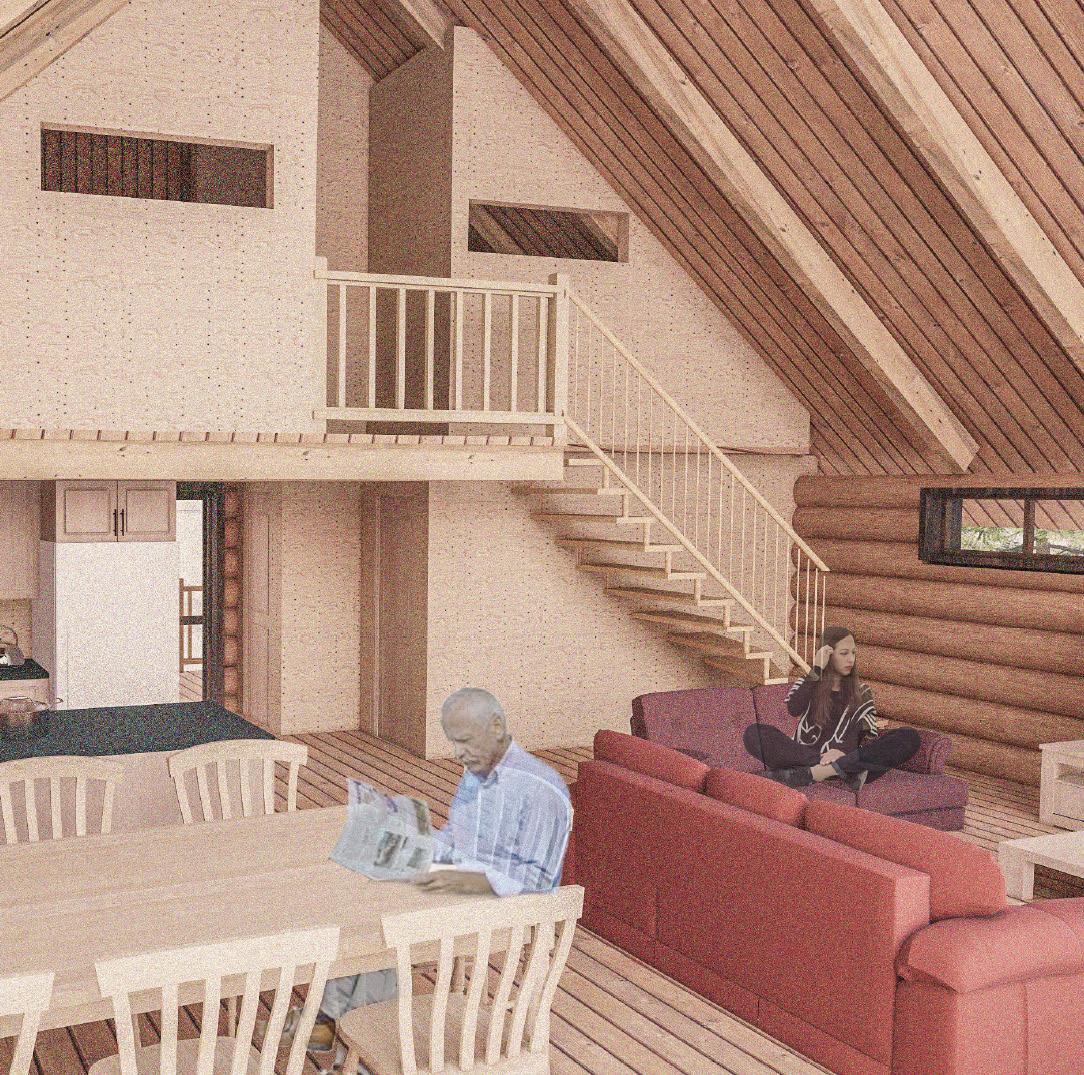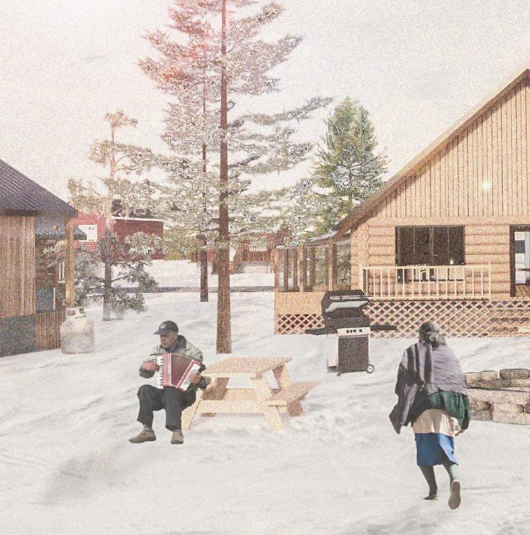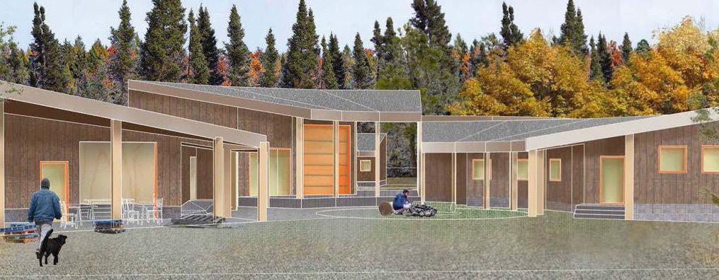 The use of typical Anishinaabe materials and techniques serves as a cultural affirmation to enhance the feeling of being at home. Inspired by the cottages built on the land, this family housing project proposes wood logs for the exterior walls and plywood for the partitions.